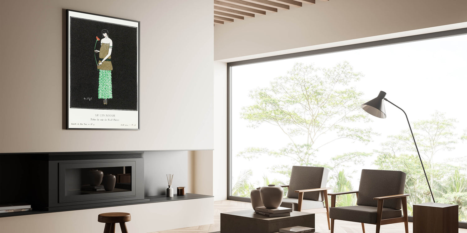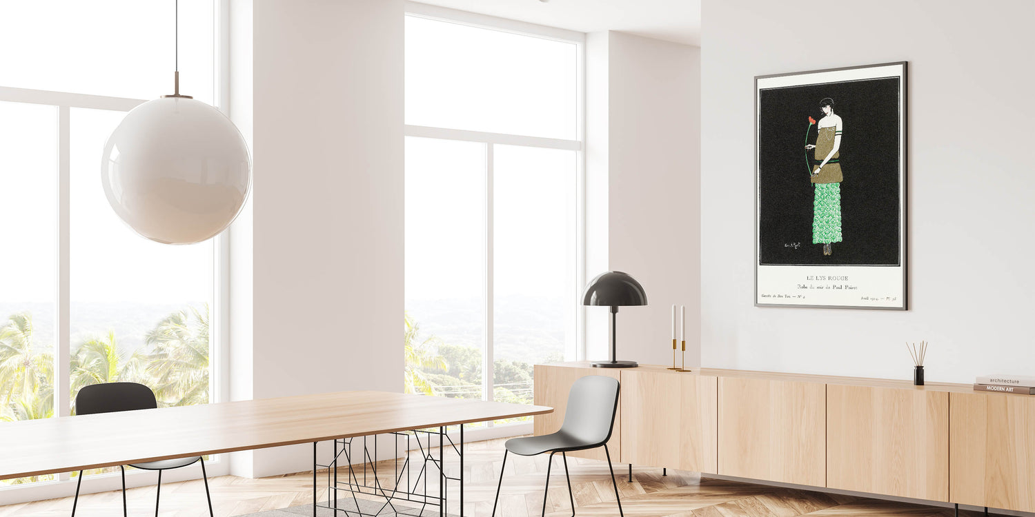 Add a touch of 1920s glamour to your space with this stunning Art Deco wall art titled "Le Lys Rouge." Featuring an elegant fashion illustration inspired by the Art Deco movement, this artwork captures the sophisticated style and bold colors typical of the era. The graceful figure, adorned in a striking green and gold ensemble, holding a single red lily, embodies the spirit of classic Art Deco design.