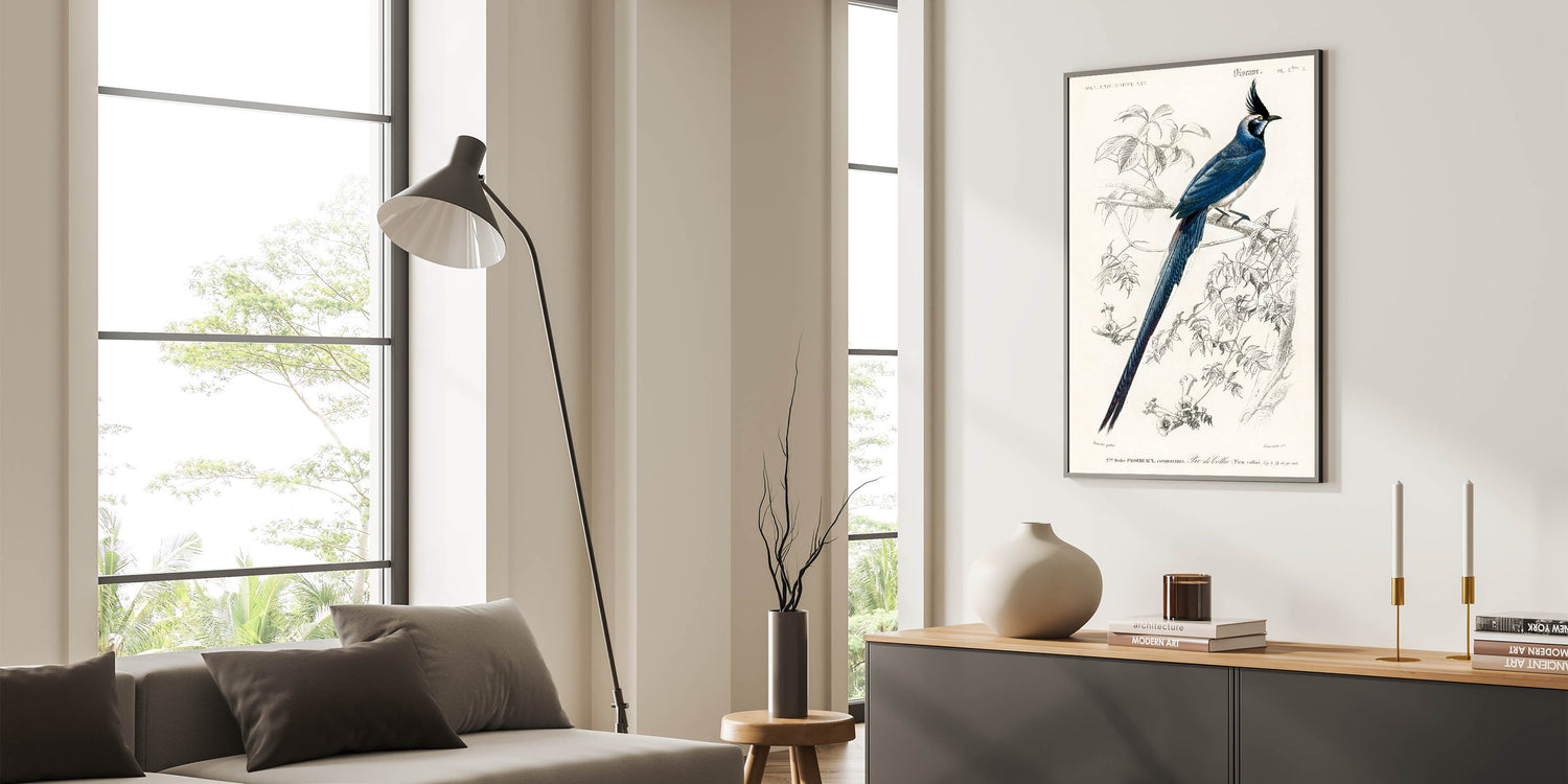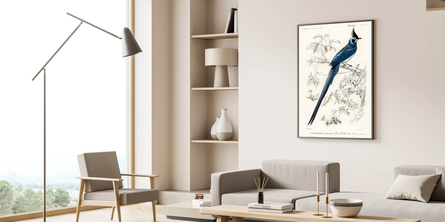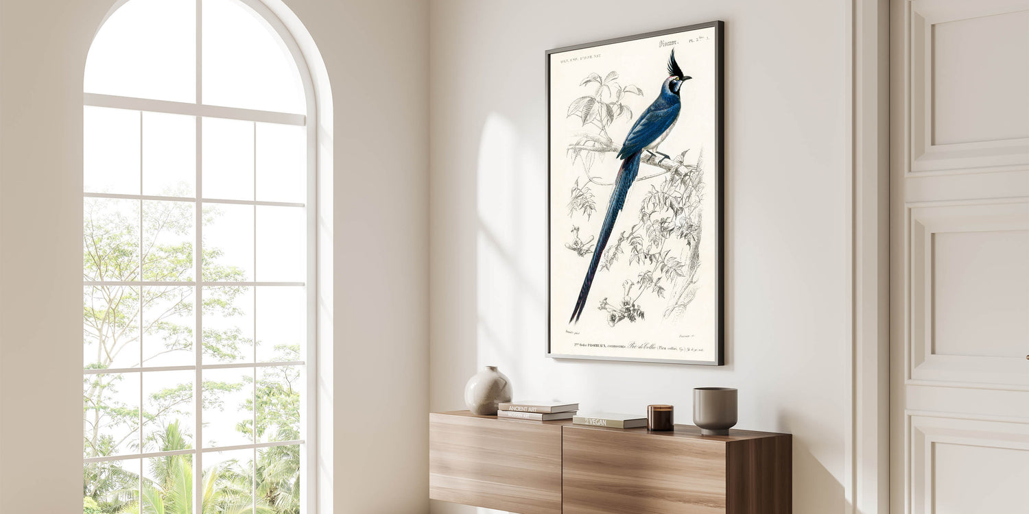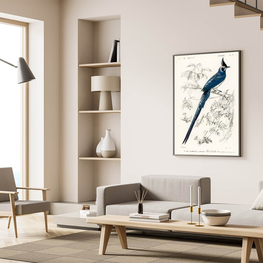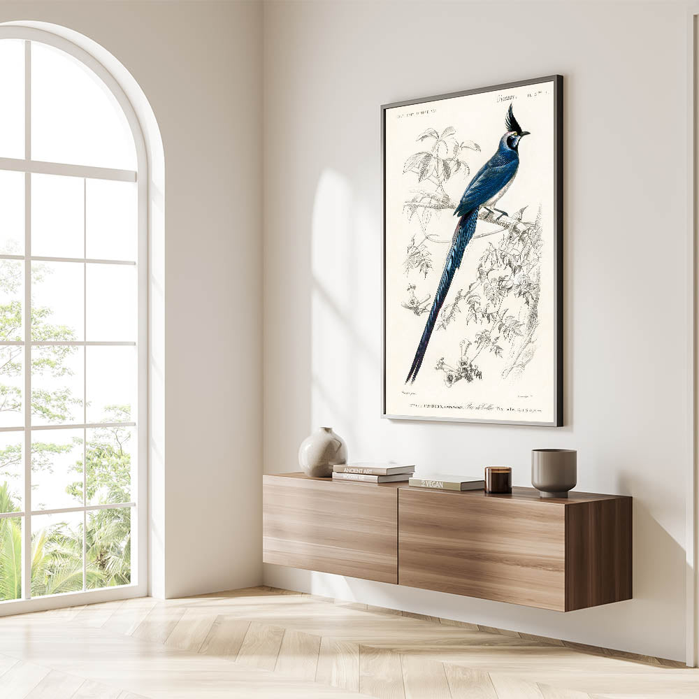 Celebrate the intricate beauty of Romanticism with this stunning illustration of the Black-Throated Magpie Jay (Pica colliei) by Charles Dessalines d'Orbigny. Featuring the bird’s striking plumage and poised elegance, this artwork masterfully blends scientific observation with artistic expression. The delicate lines of the branches and flowers frame the vibrant blues and blacks of the bird, creating a harmonious and captivating composition.