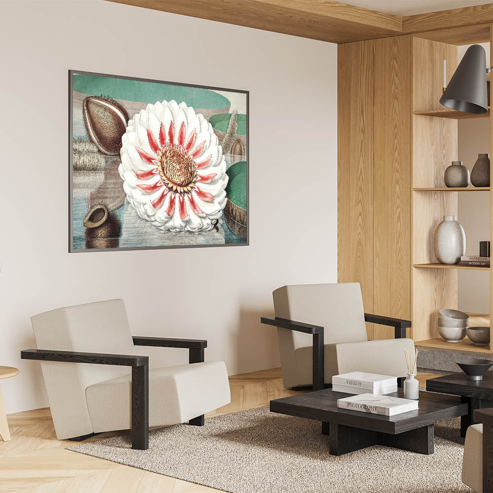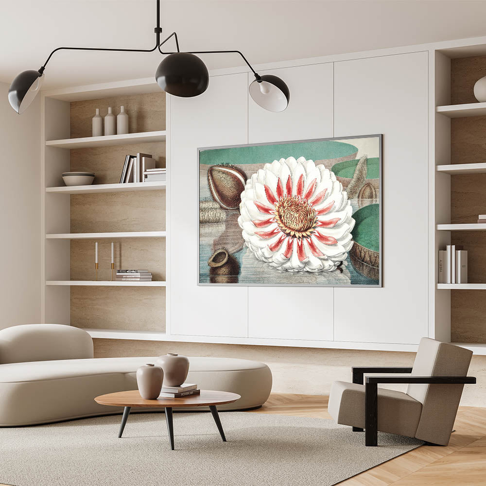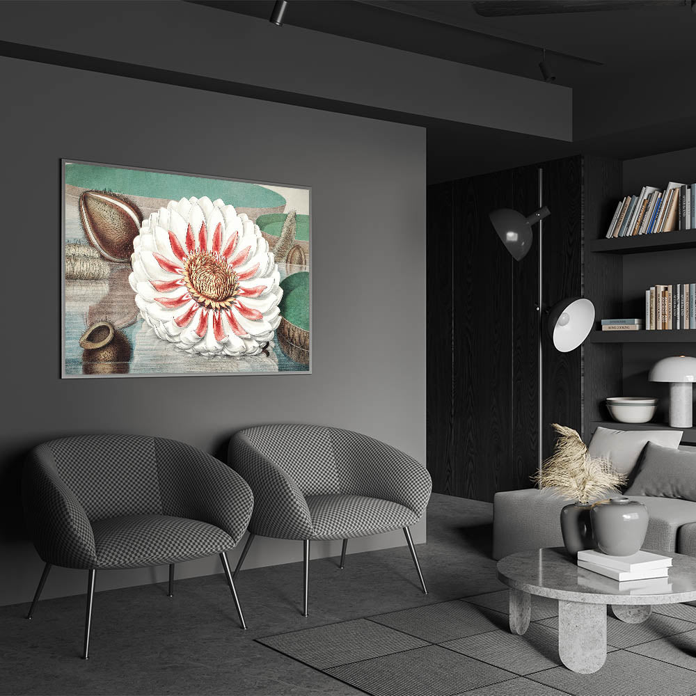 Add a stunning touch of botanical beauty to your decor with "The Victoria Regia: or the Great Water Lily of America" by William Sharp. This remarkable artwork from 1854 captures the intricate details and vibrant colors of the grand water lily in full bloom. The composition features delicate white petals accented with red tips, surrounded by lush green lily pads and seed pods, creating a serene yet captivating scene. This piece is perfect for lovers of botanical art and anyone who appreciates nature’s wonders.