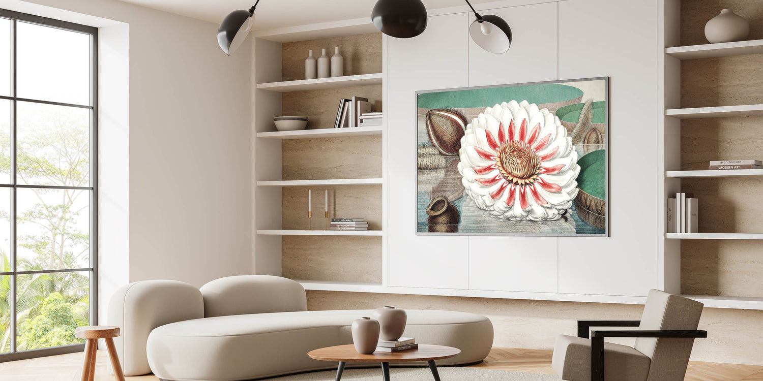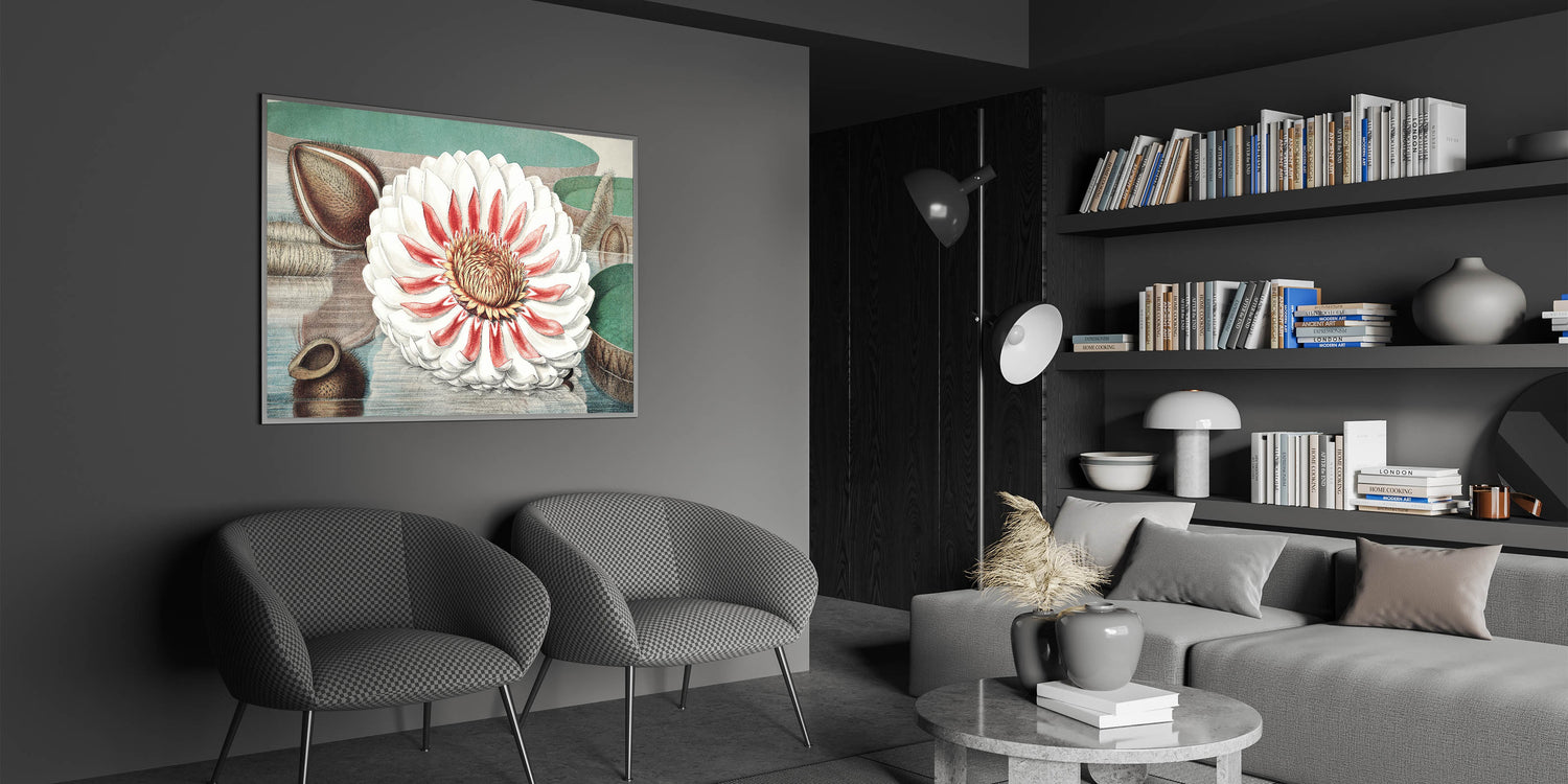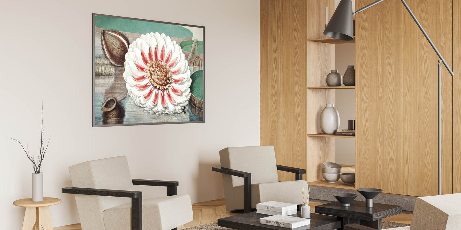Add a stunning touch of botanical beauty to your decor with "The Victoria Regia: or the Great Water Lily of America" by William Sharp. This remarkable artwork from 1854 captures the intricate details and vibrant colors of the grand water lily in full bloom. The composition features delicate white petals accented with red tips, surrounded by lush green lily pads and seed pods, creating a serene yet captivating scene. This piece is perfect for lovers of botanical art and anyone who appreciates nature’s wonders.