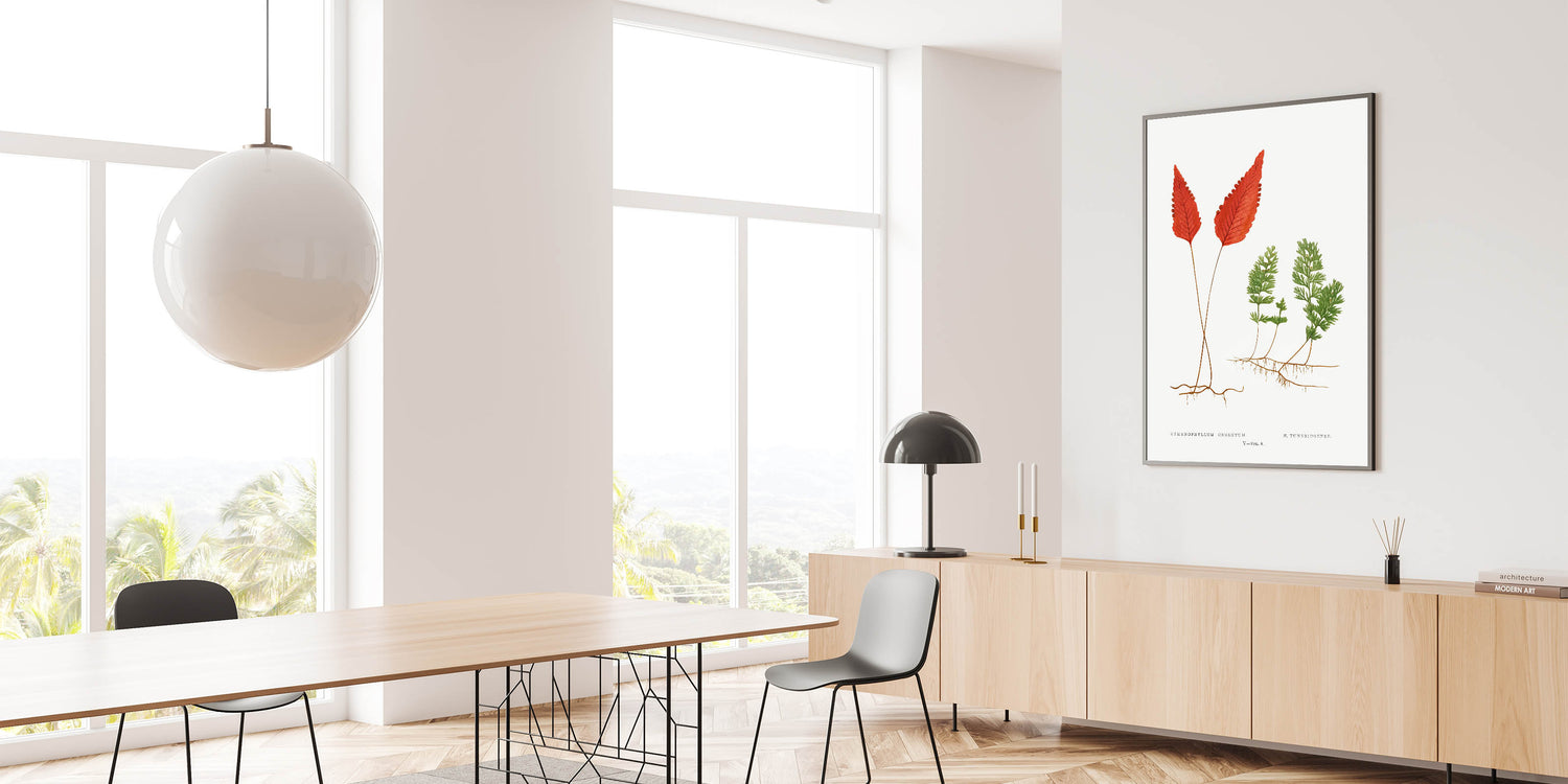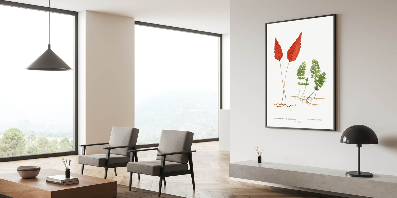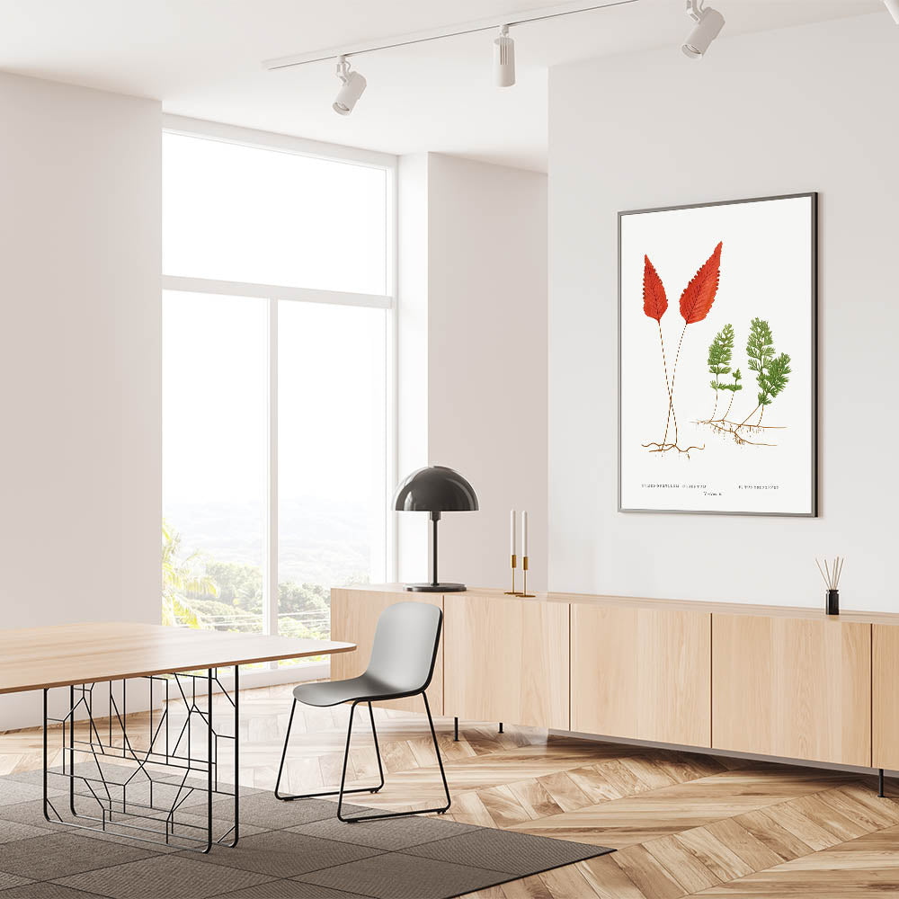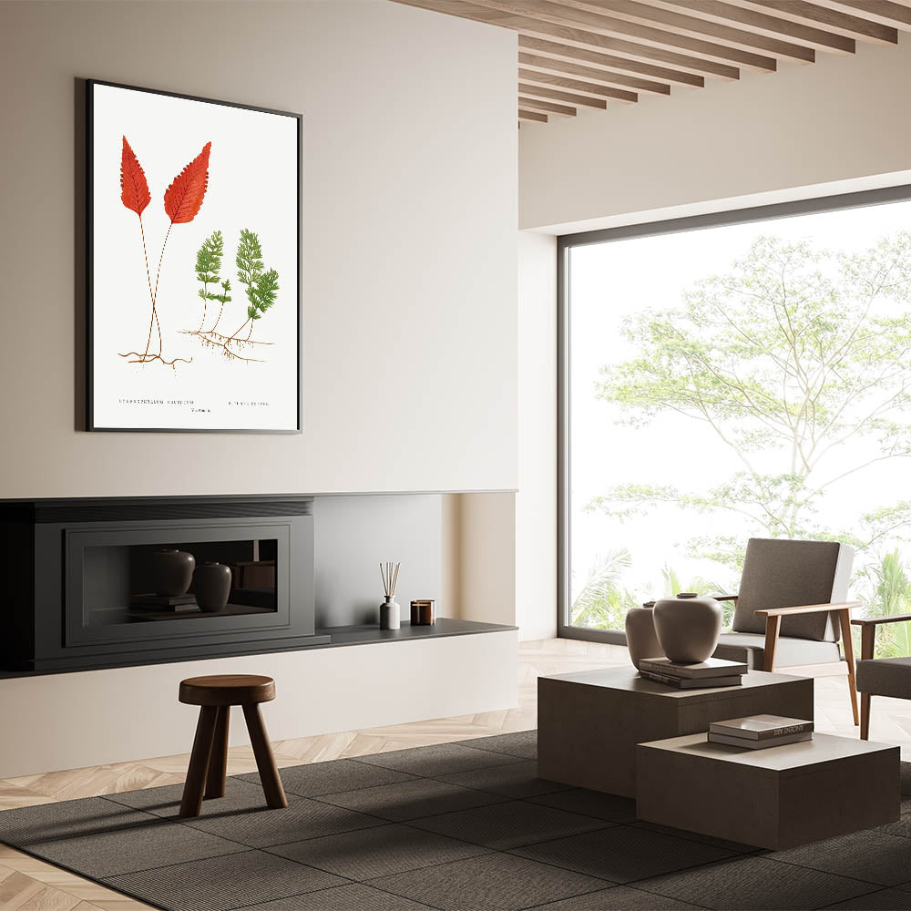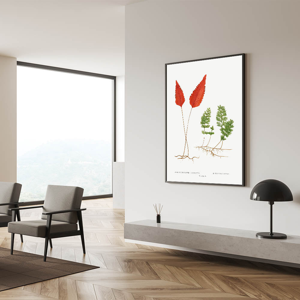 Enhance your decor with this beautifully detailed botanical print of "Hymenophyllum Cruentum and H. Tunbridgense" by Edward Joseph Lowe. This artwork, part of a collection from 1856-1860, features two types of delicate ferns illustrated with precision and vibrant natural colors. The contrasting red and green fronds, along with intricate root structures, bring a touch of nature’s elegance and refinement into any space. Perfect for plant lovers and art enthusiasts alike, this Realism print captures the beauty of botany with both scientific accuracy and artistic flair.