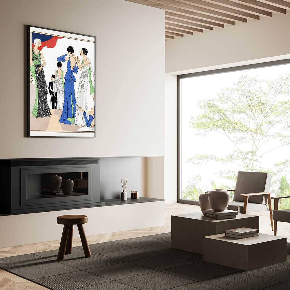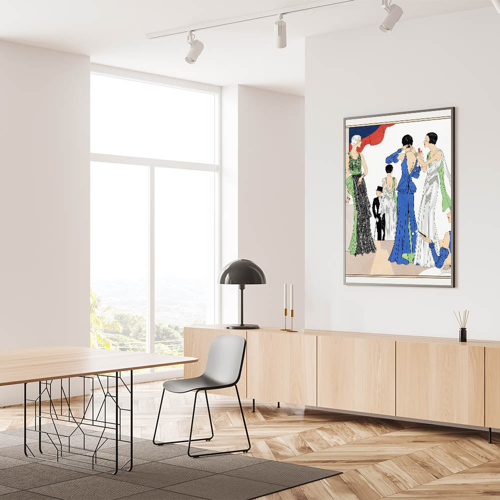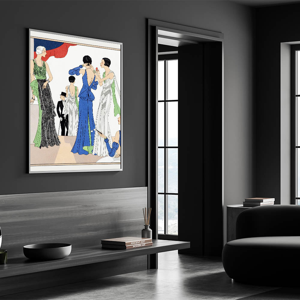 Embrace the glamour and sophistication of the 1920s with this captivating Art Deco wall art. Featuring elegantly dressed figures in rich, vibrant colors, this artwork captures the essence of Art Deco patterns and style. The design highlights classic 1920s fashion, showcasing luxurious gowns and refined elegance, perfect for adding a vintage touch to your living space. This piece is ideal for those who appreciate the opulent style and architecture that defined the Art Deco era.