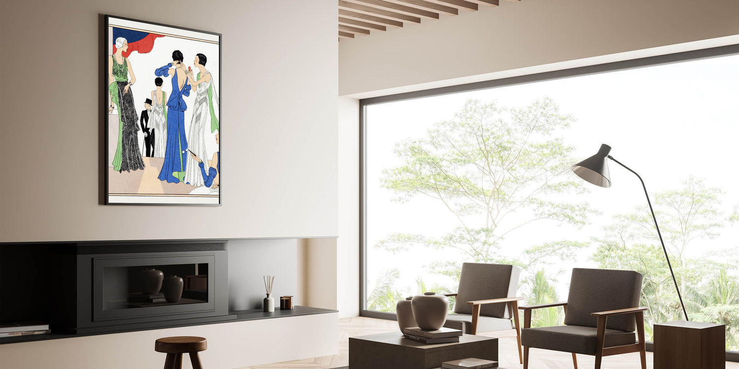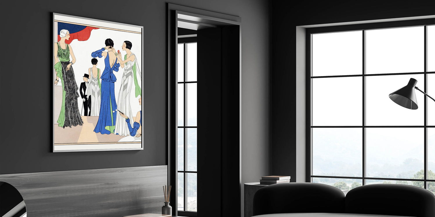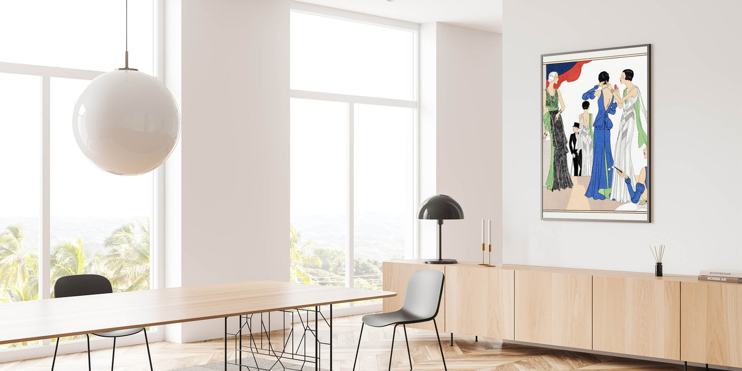 Embrace the glamour and sophistication of the 1920s with this captivating Art Deco wall art. Featuring elegantly dressed figures in rich, vibrant colors, this artwork captures the essence of Art Deco patterns and style. The design highlights classic 1920s fashion, showcasing luxurious gowns and refined elegance, perfect for adding a vintage touch to your living space. This piece is ideal for those who appreciate the opulent style and architecture that defined the Art Deco era.