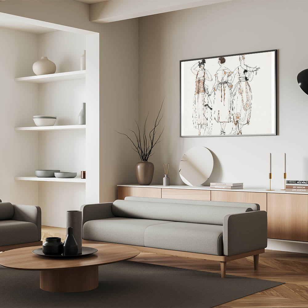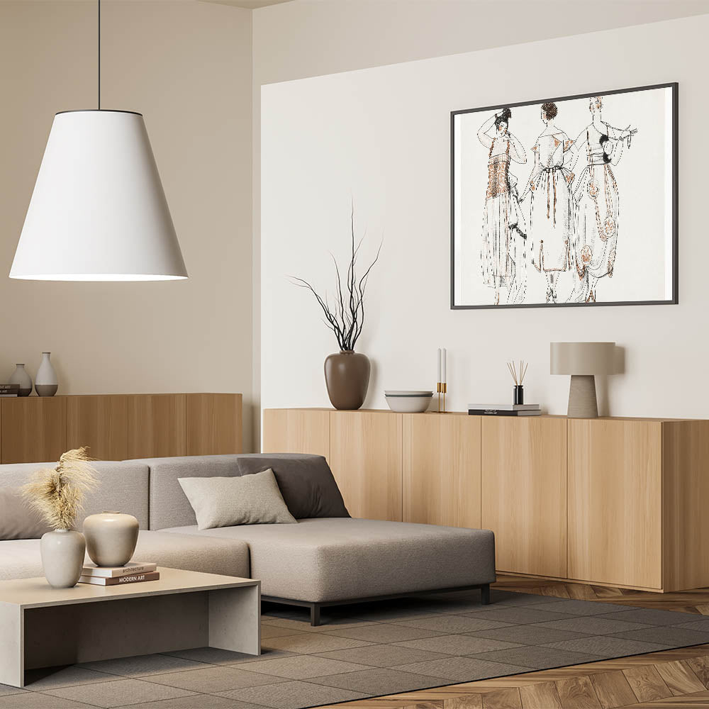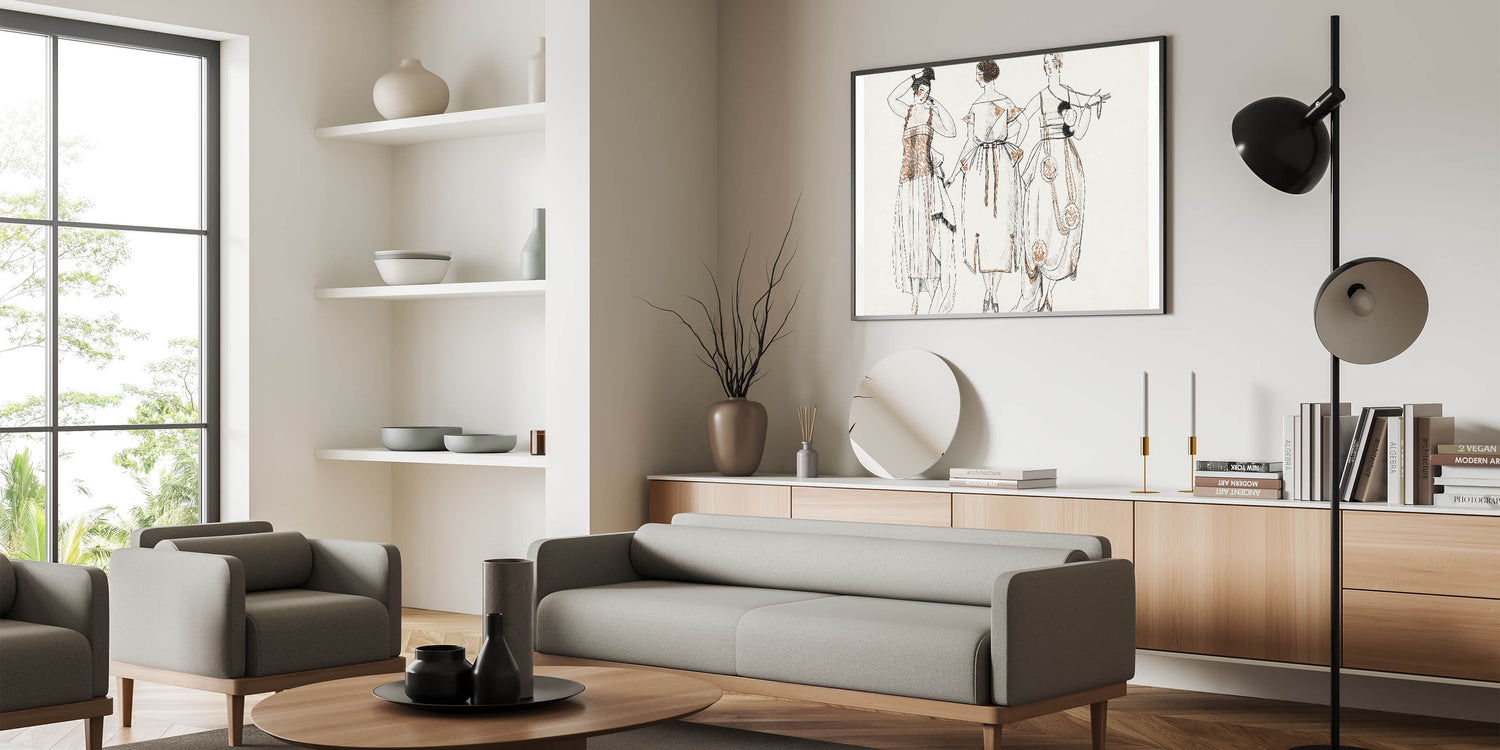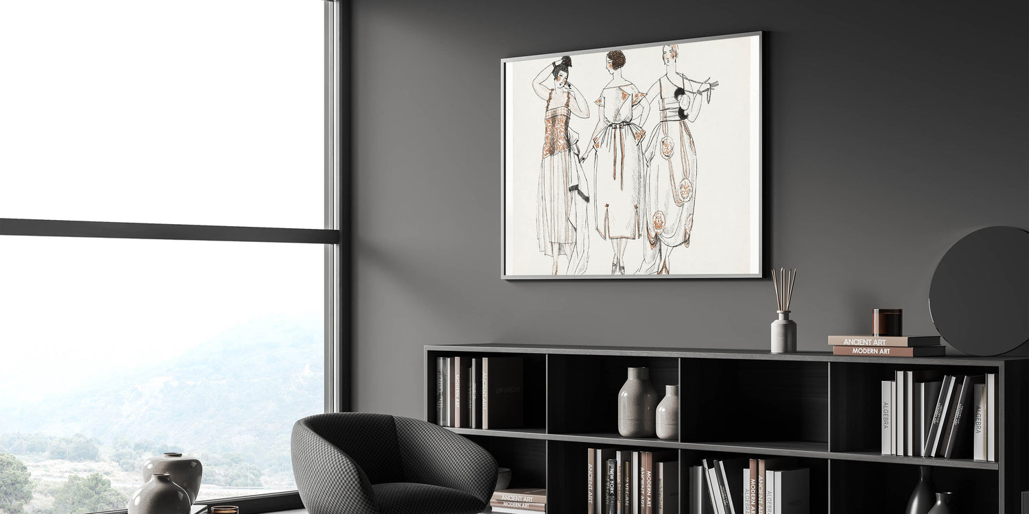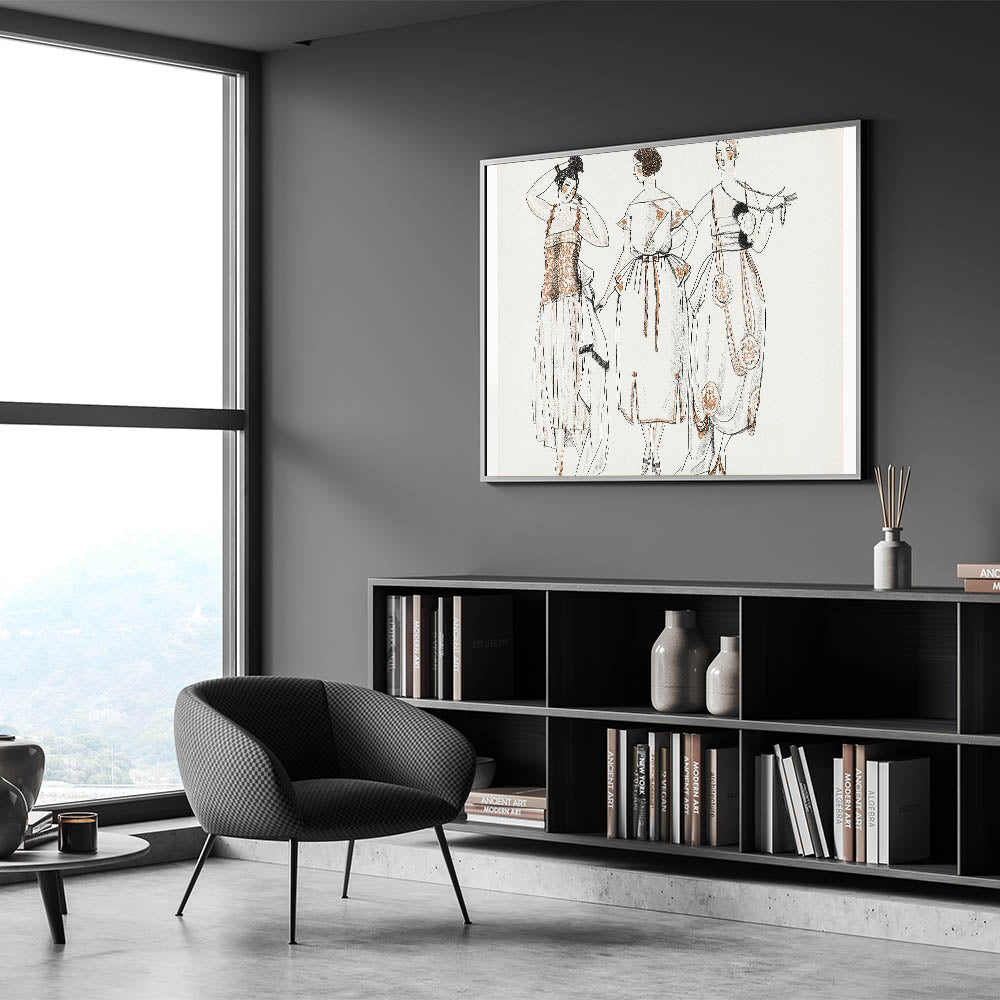 Capture the timeless elegance of 1920s fashion with this stunning Art Deco wall art. This piece showcases three poised figures dressed in iconic Art Deco styles, reflecting the sophisticated designs and intricate patterns of the era. The minimal color palette with warm, muted tones makes it an ideal choice for creating a refined yet chic atmosphere in any space.
