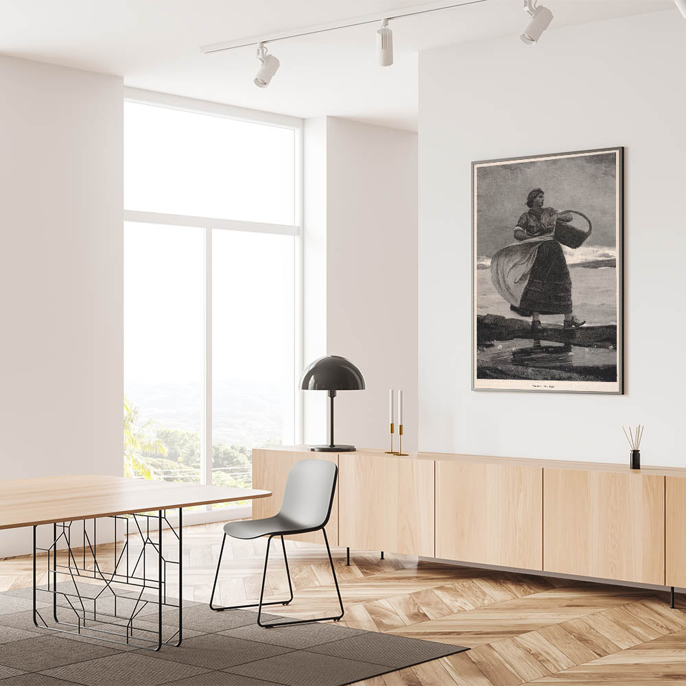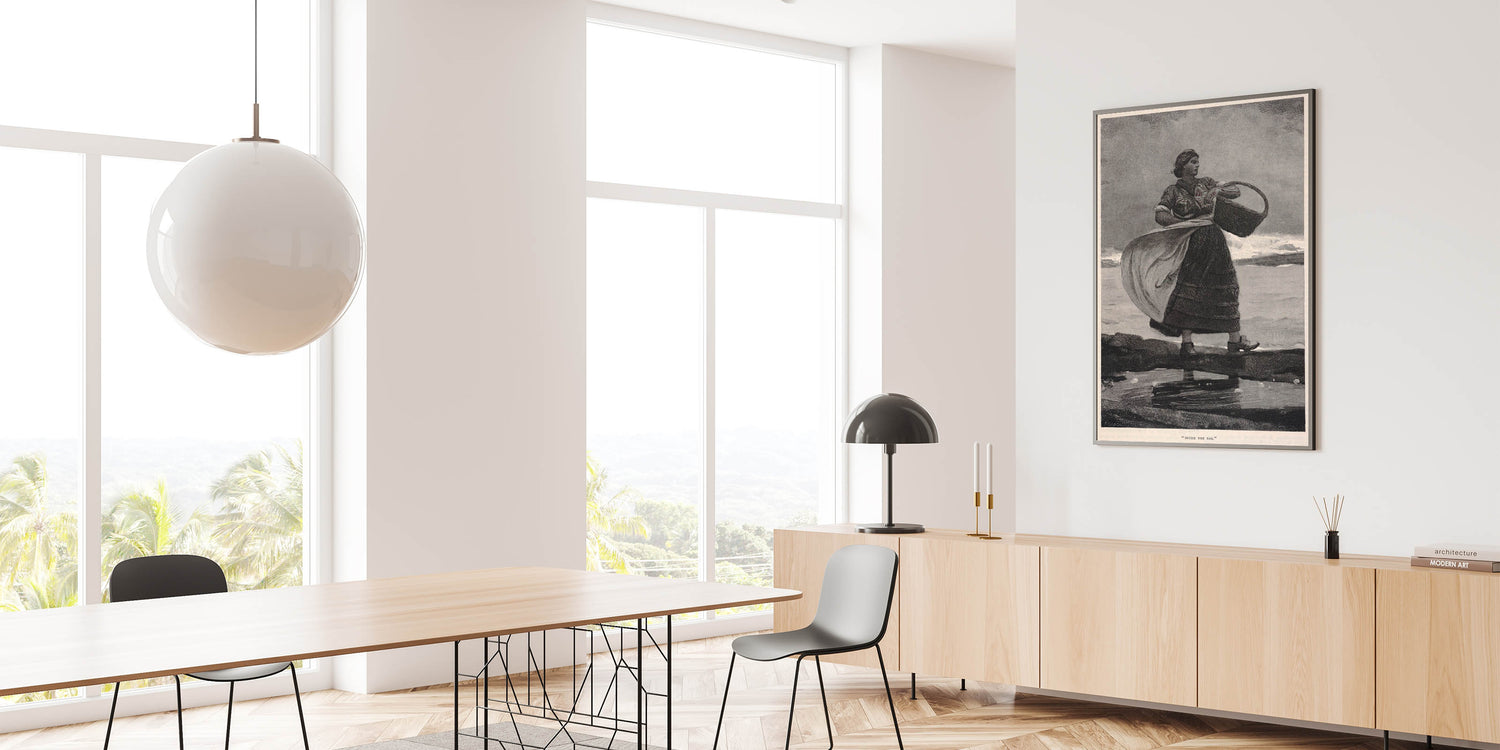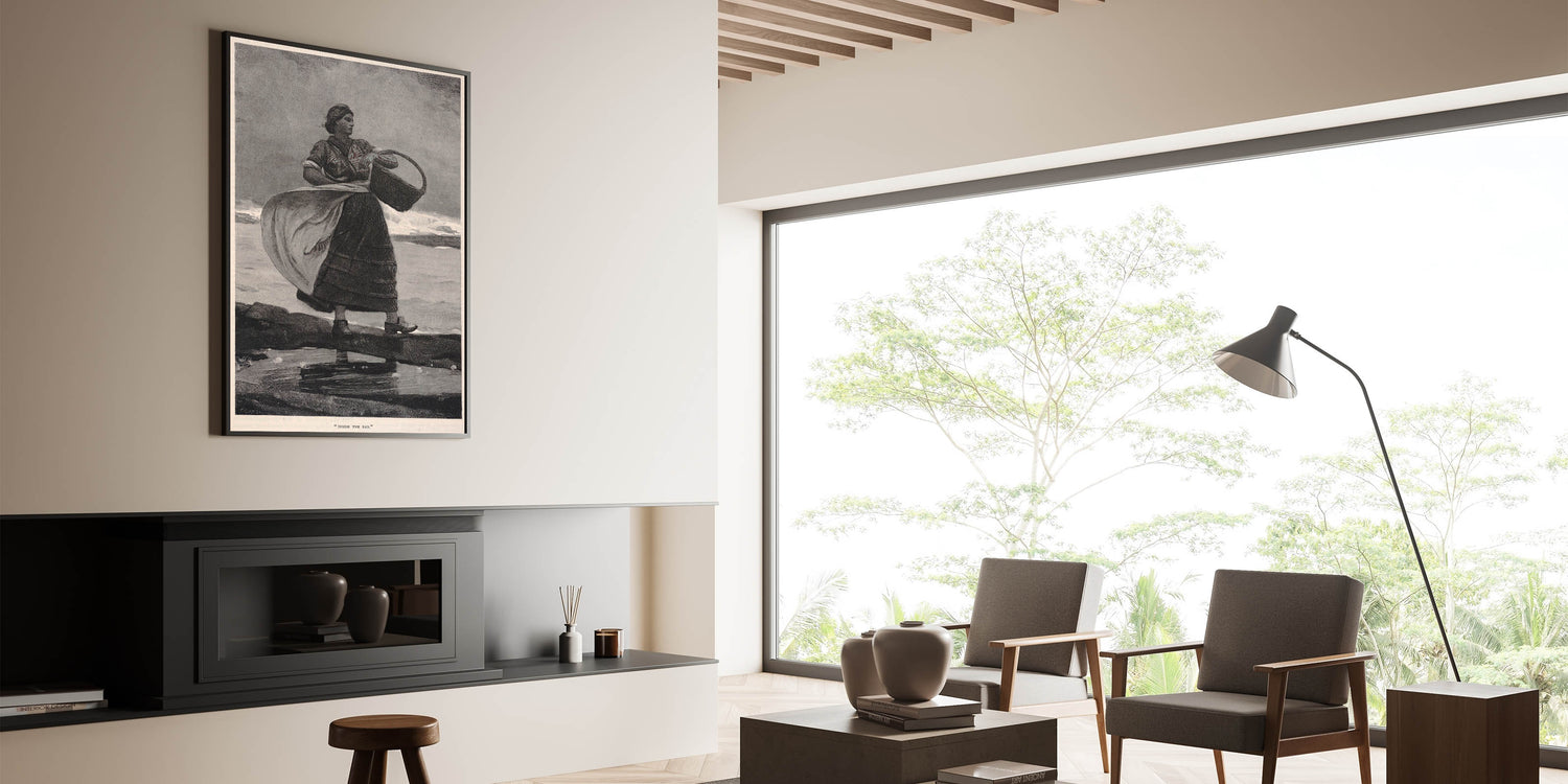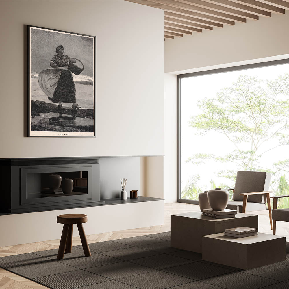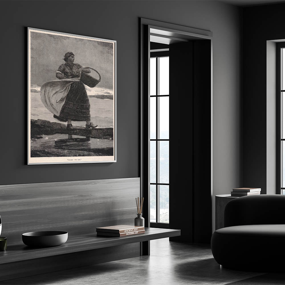 Bring a sense of history and coastal resilience into your home with this Realism print, "Inside the Bar." This classic illustration portrays a strong, determined woman standing against the wind, basket in hand, embodying the enduring spirit of coastal life. The monochromatic tones and fine detailing capture the mood and strength of the subject, making it a timeless piece that resonates with admirers of historical and maritime art.