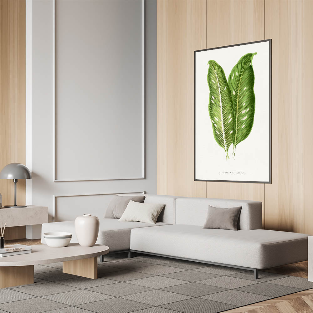 Transform your space with this elegant Romanticism style wall art, showcasing the intricate Green Dieffenbachia Baraquiniana leaf. This botanical masterpiece originates from the 1865 edition of Les Plantes à Feuillage Coloré by Alexander Francis Lydon and Benjamin Fawsett. Its lush, detailed rendering of vibrant green leaves with delicate white markings reflects the classic art of the Romantic era, celebrating the beauty and intricacy of nature.