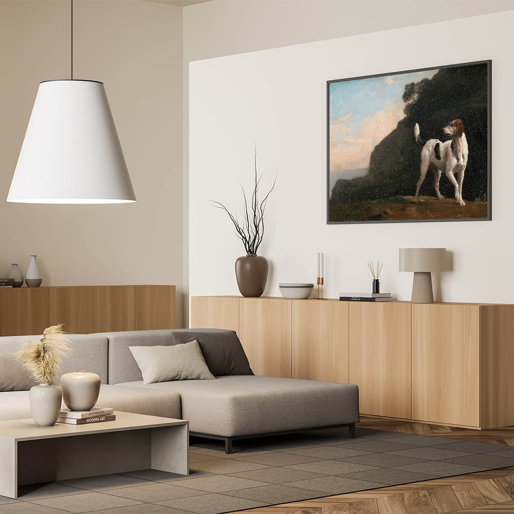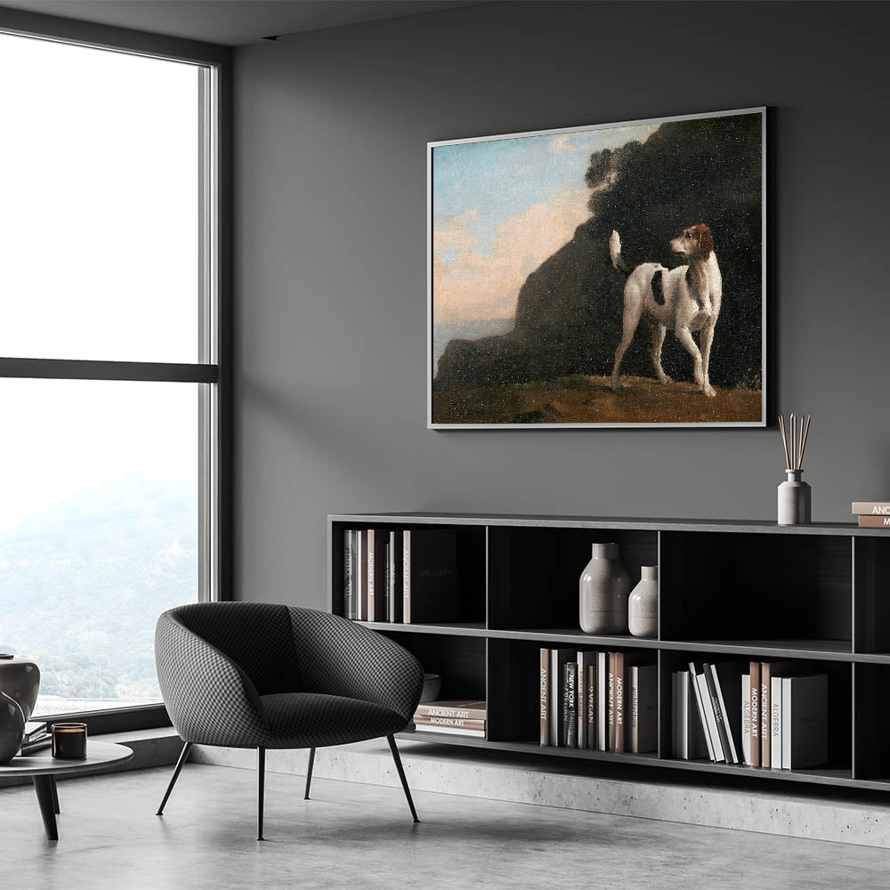 Embrace the timeless elegance of Romanticism with this stunning depiction of a Foxhound by George Stubbs, created in 1760. This exquisite artwork captures the quiet strength and beauty of the dog in a serene natural setting, showcasing the Romantic era's appreciation for animals and landscapes. Perfect for dog lovers and art enthusiasts, this piece adds a sense of history and sophistication to any space.