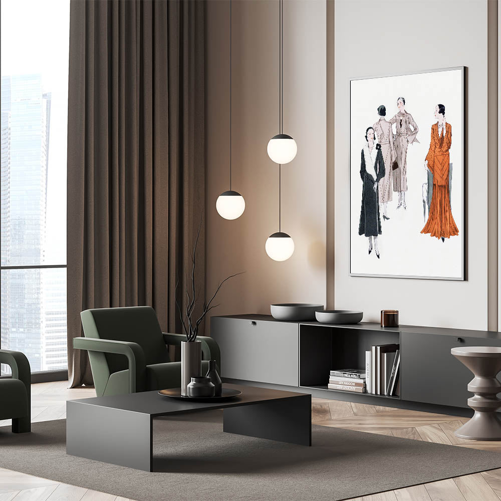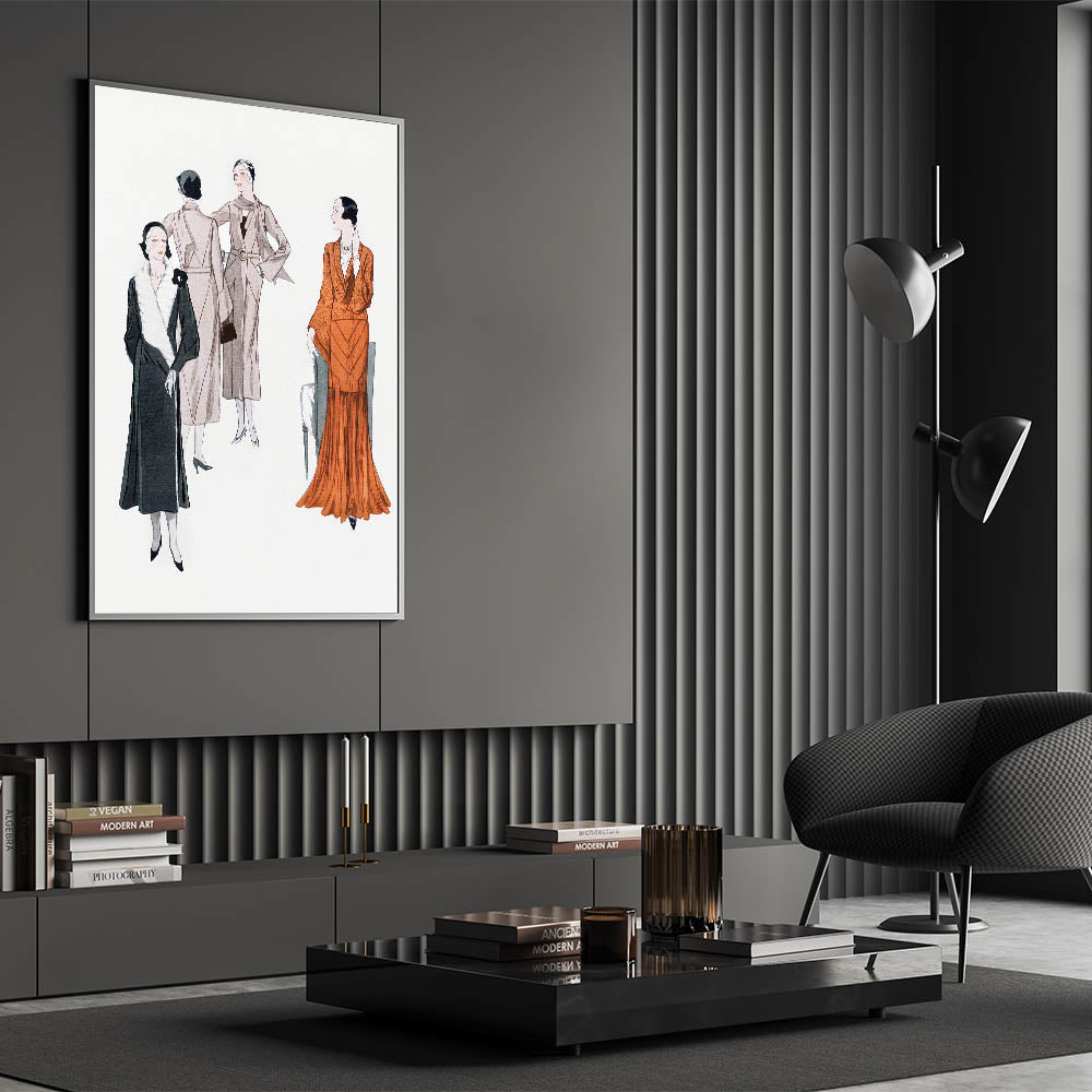 Step into the world of 1920s glamour with this exquisite Art Deco wall art featuring a collection of elegantly dressed women. Each figure showcases the iconic styles of the era, from luxurious evening gowns to sophisticated daywear, all adorned with chic accessories. The subtle color palette and refined lines capture the sophistication and charm of the time, making it a perfect addition to any art collection.