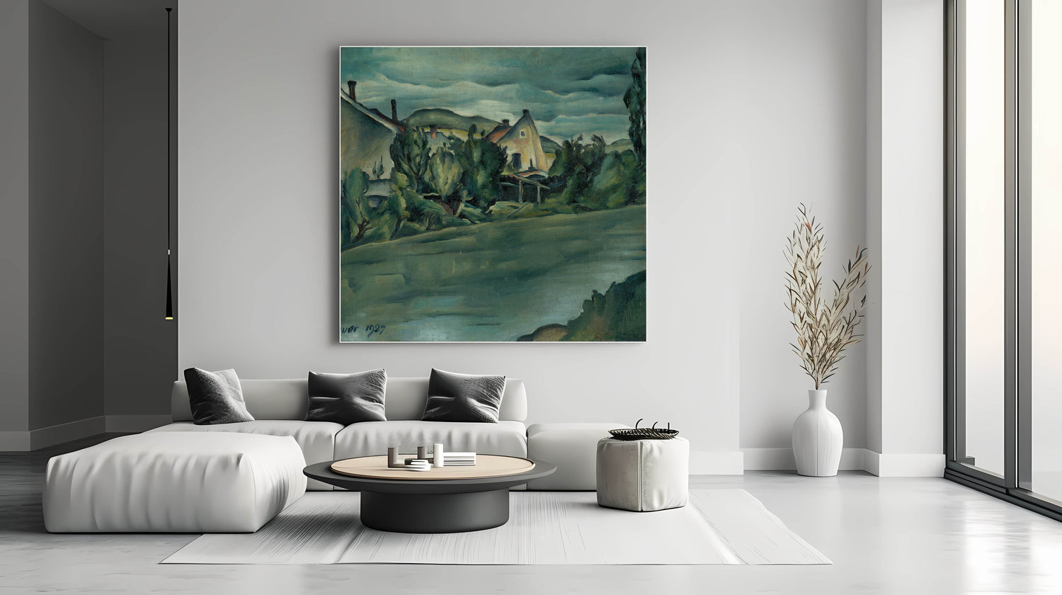 Experience the serene beauty of Řahanov Lines by Konštantín Bauer, a masterful Expressionist depiction of a quiet rural landscape. This piece captures the charm of a countryside scene, with rolling hills, quaint houses, and lush greenery painted in soft, muted tones of green and gray. The gentle brushstrokes and subtle gradation of colors evoke a sense of tranquility and timelessness, making it a perfect addition to any art collection.