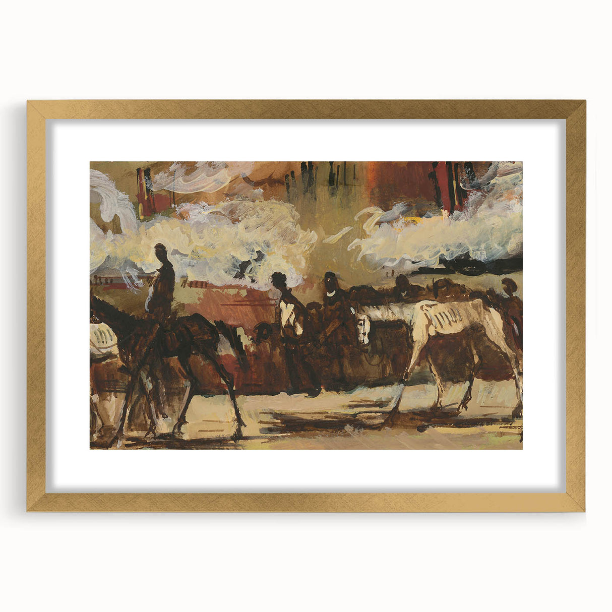 Explore the evocative world of Expressionism with Riders by Cyprián Majerník. This powerful artwork portrays a group of skeletal horses and figures against a turbulent, smoky background. The stark contrasts of white, brown, and red tones convey a somber narrative, capturing themes of perseverance and the fragility of life. Majerník's expressive brushstrokes create a dynamic and poignant composition that resonates deeply, making it a remarkable centerpiece for any art collection.