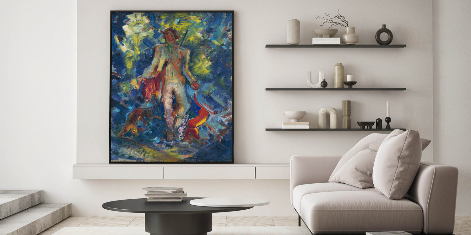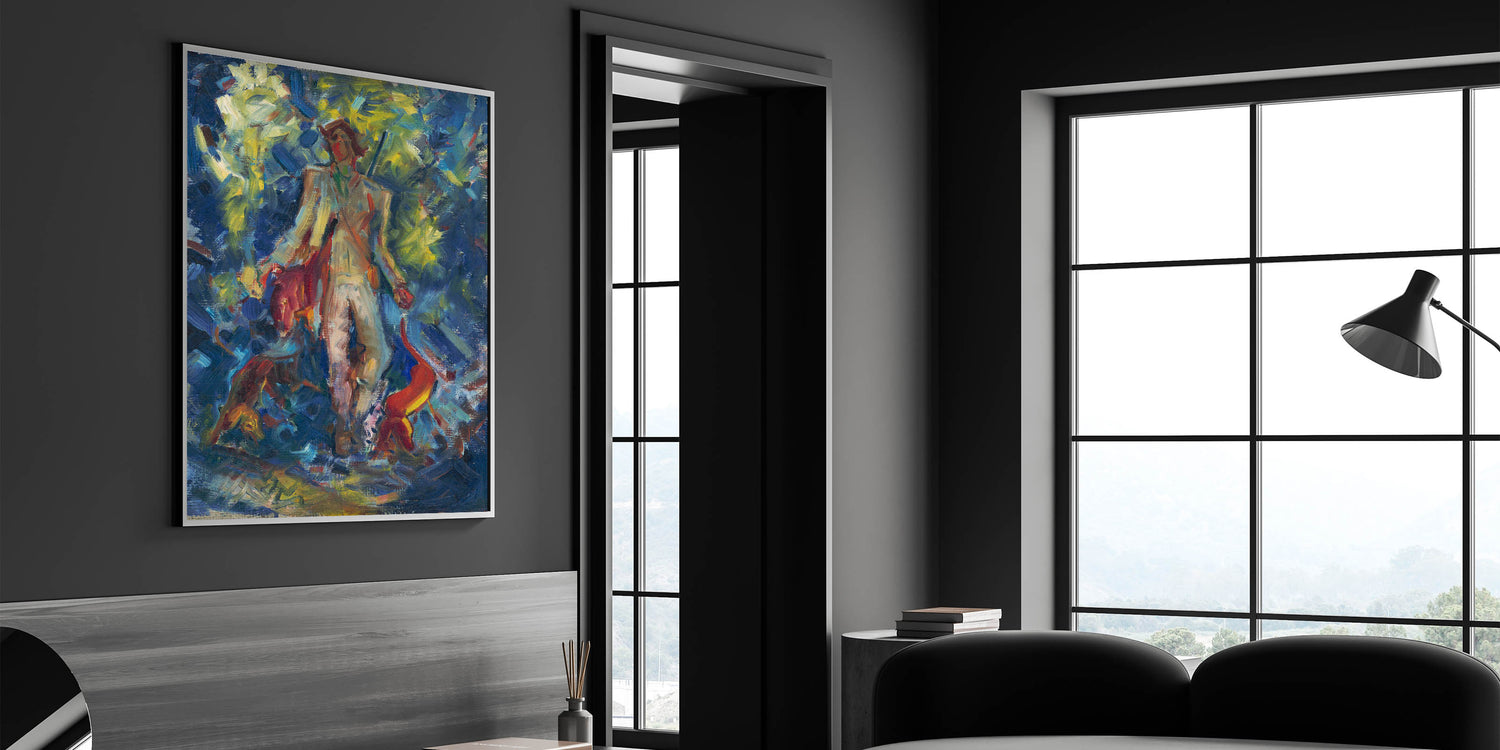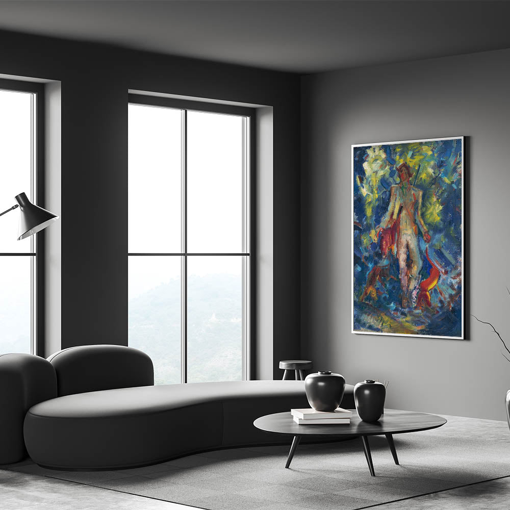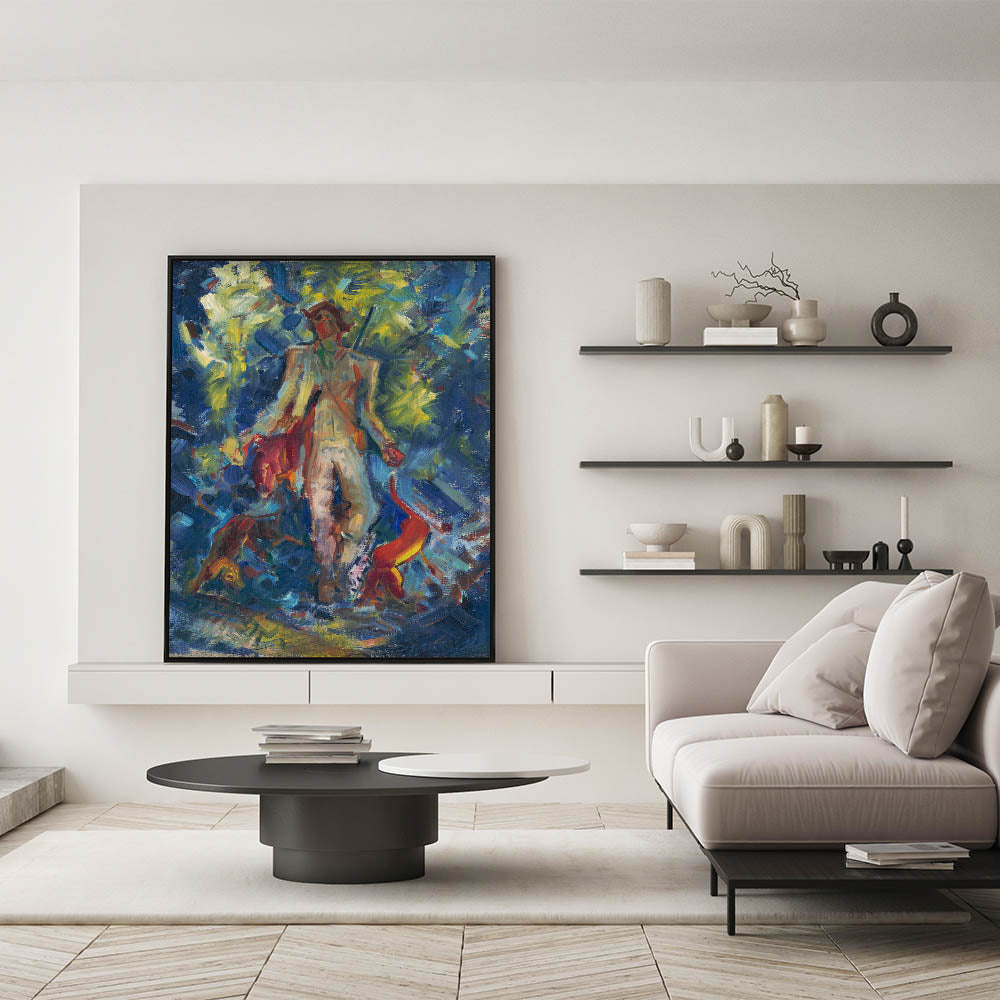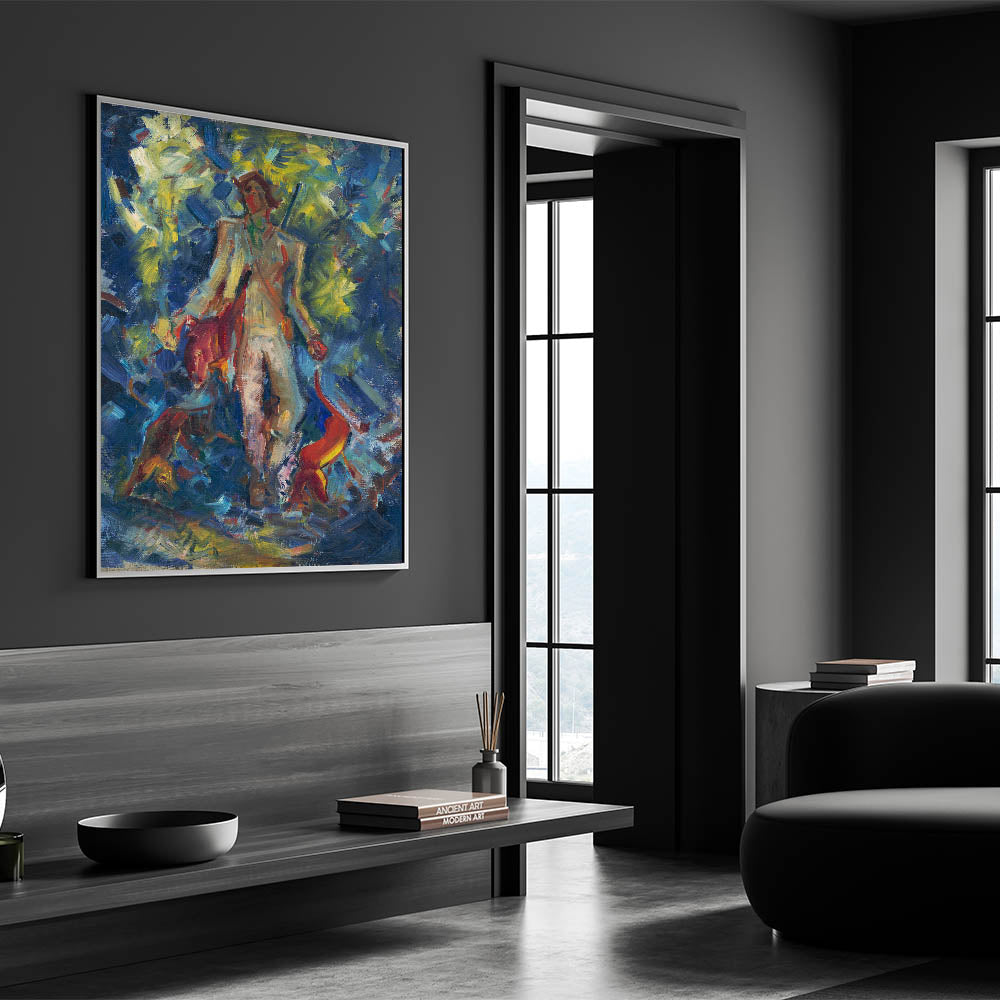 Step into the world of vibrant colors and dynamic motion with Arnold Peter Weisz-Kubínčan’s "Standing Huntsman with Two Dogs." This expressive painting showcases the rich brushwork and evocative color palette characteristic of the Expressionism art movement. Depicting a huntsman and his two loyal dogs in a vividly abstracted landscape, this piece offers a striking centerpiece for any room or collection.