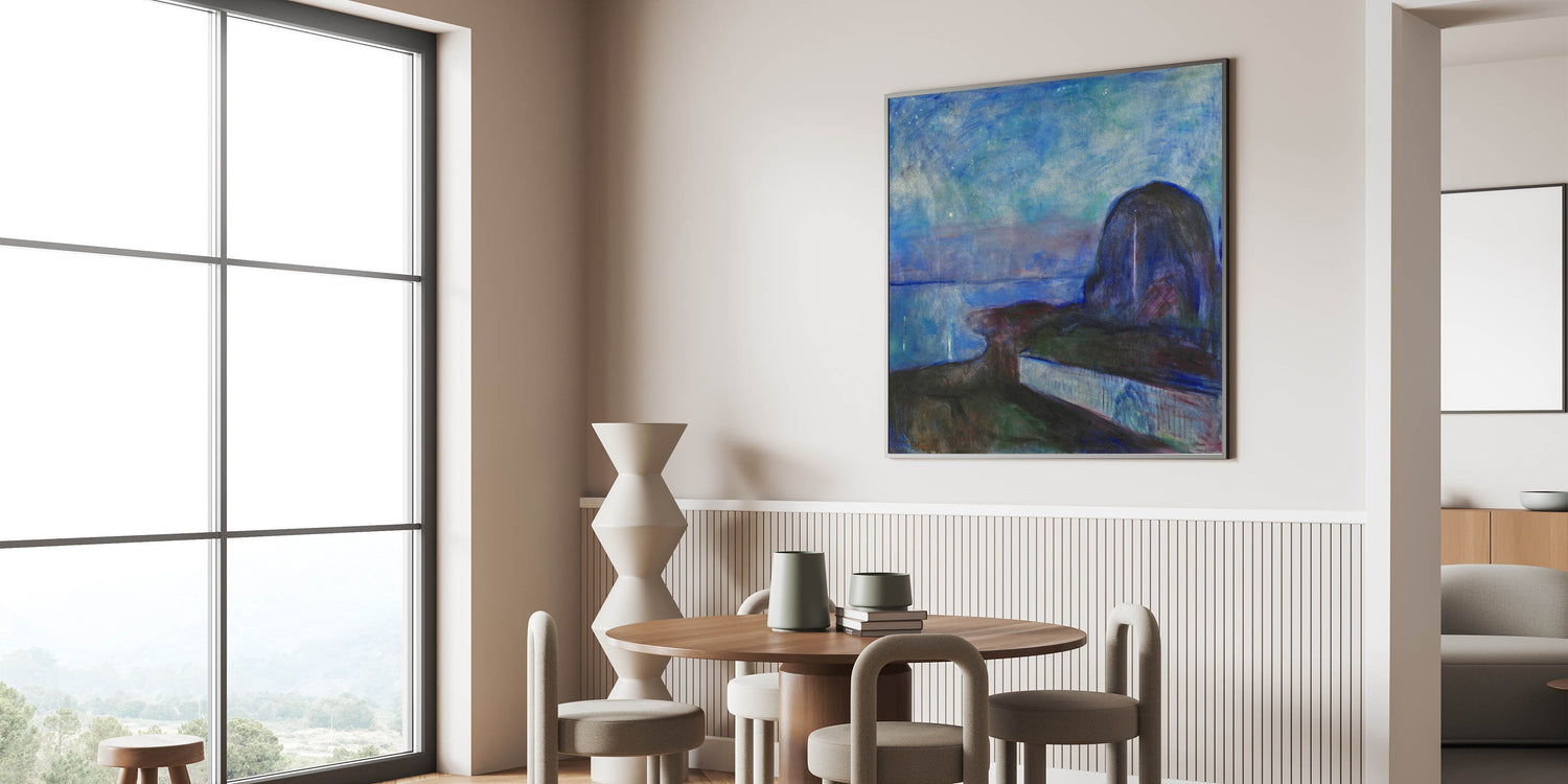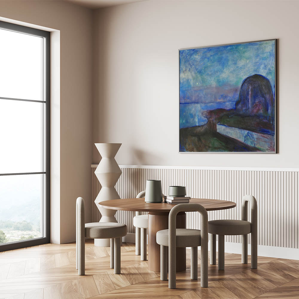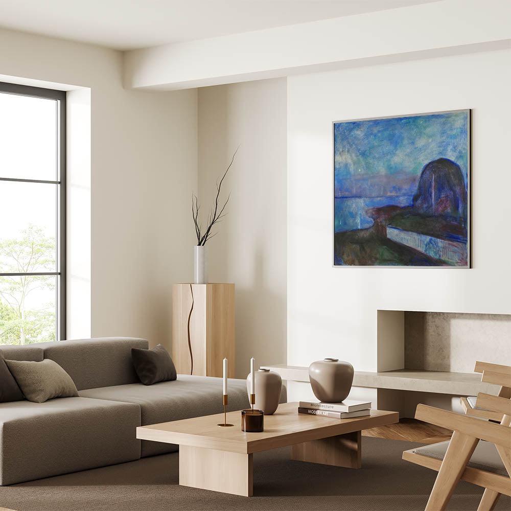 Explore the captivating beauty of modern Expressionism with Edvard Munch’s "Starry Night" (1893). This iconic masterpiece transports viewers to a serene yet haunting nocturnal landscape, where deep blues and ethereal light blend to create an atmosphere of introspection and wonder. Munch's expressive brushstrokes and striking contrasts make this artwork a timeless addition to any art collection or interior space.
