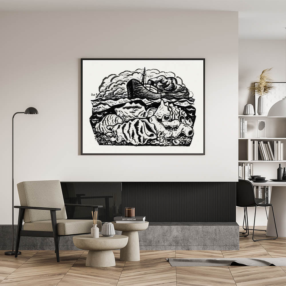 Experience the dramatic power of Expressionism with Leo Gestel’s "Steamship at Sea" (ca. 1891–1941). This bold black-and-white piece captures the force of nature and the industrial might of the steamship, blending motion and emotion with masterful line work. The contrast between the crashing waves, the ship, and the surrounding chaos creates a compelling narrative of human endurance and nature’s power.