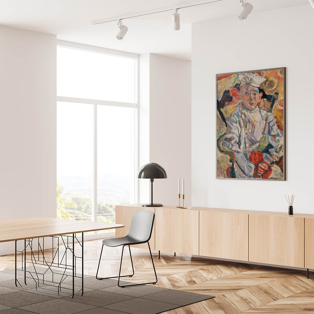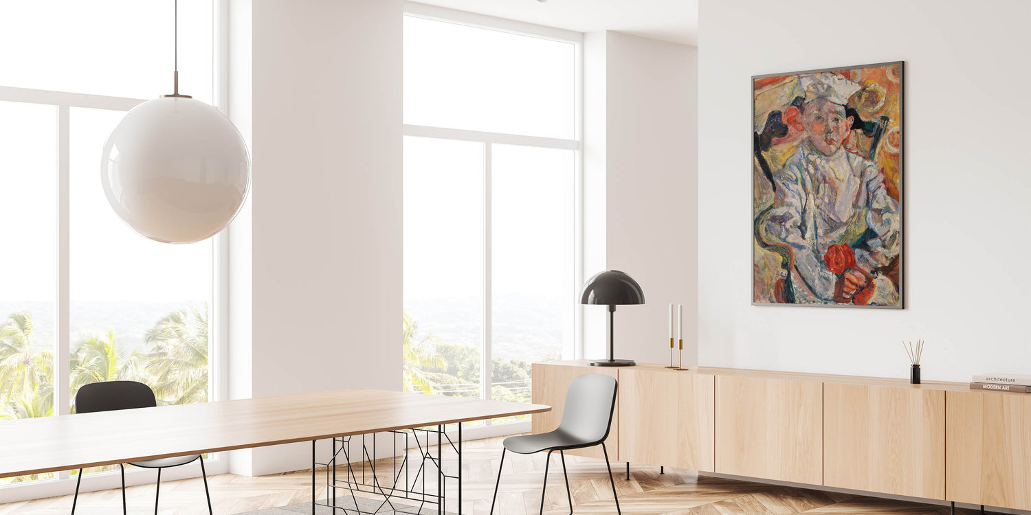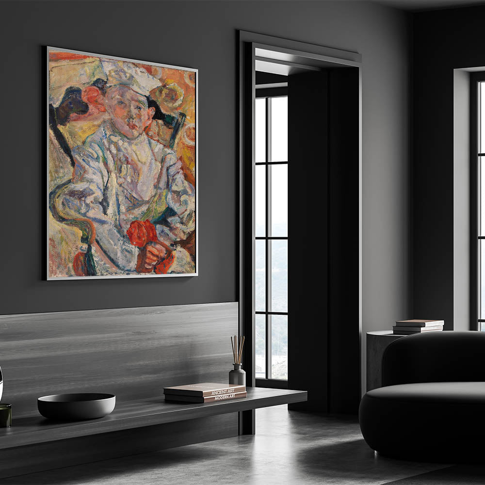 Immerse yourself in the vivid world of Chaim Soutine with "The Pastry Chef," also known as "Baker Boy" or "Le Pâtissier." This vibrant Expressionist portrait bursts with energetic brushstrokes and a bold use of color, capturing the dynamic personality of the chef. The blend of soft pastels and warm tones creates a lively, almost chaotic atmosphere, a hallmark of Soutine's unique style. The figure’s expressive posture and gaze add depth and emotion, making this artwork a standout piece for collectors and art enthusiasts alike.