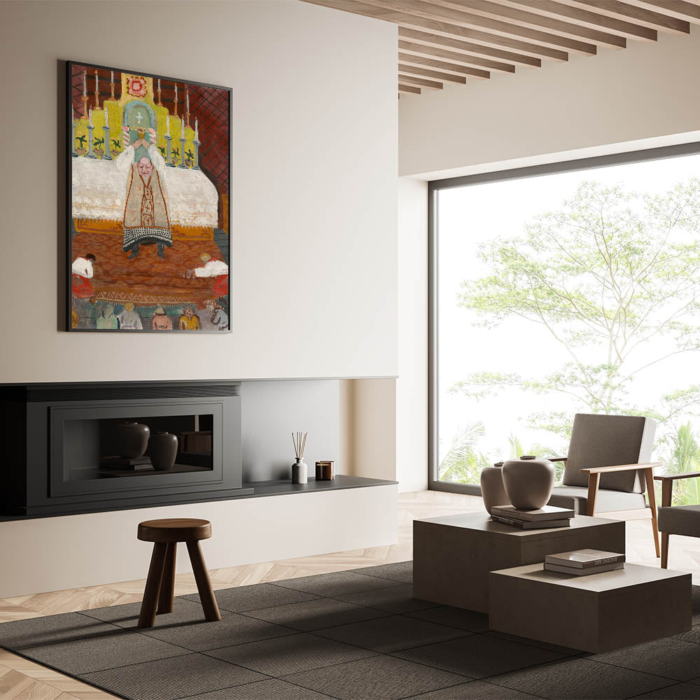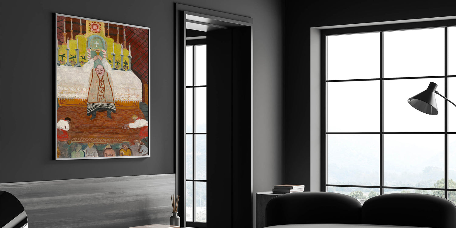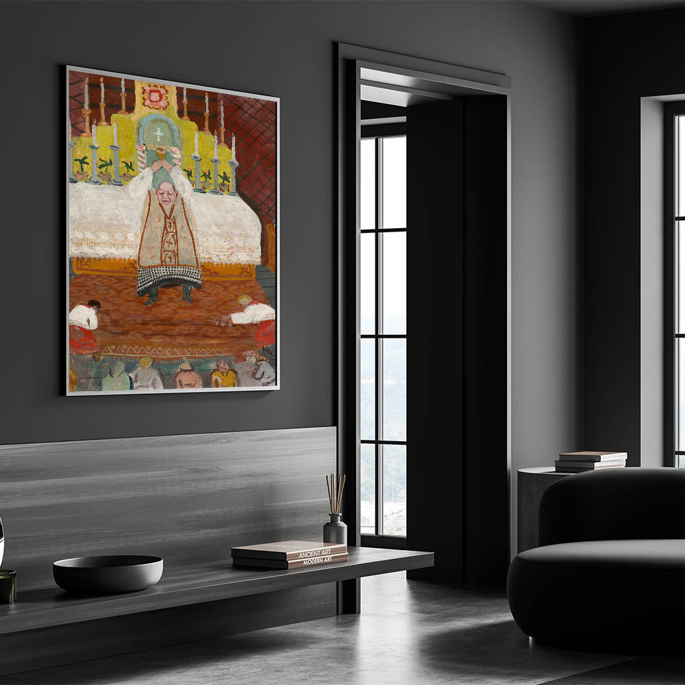 Explore the emotional depth of Expressionism with "Upheaval" by Cyprián Majerník. This striking piece captures a solemn yet vibrant scene of religious devotion, showcasing a priest holding a chalice during a moment of prayer. The rich, earthy tones and intricate details of the altar create a compelling visual narrative, bringing spiritual intensity to the forefront.