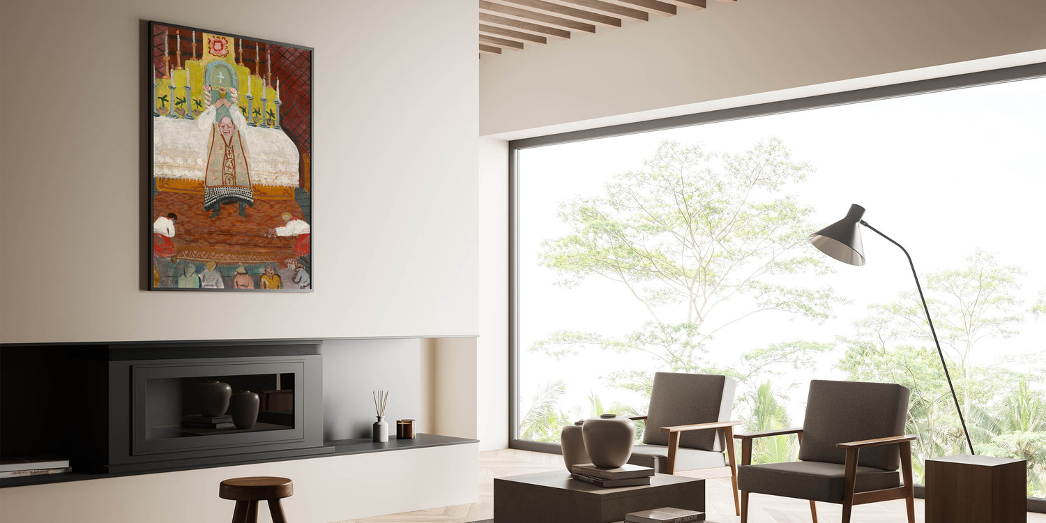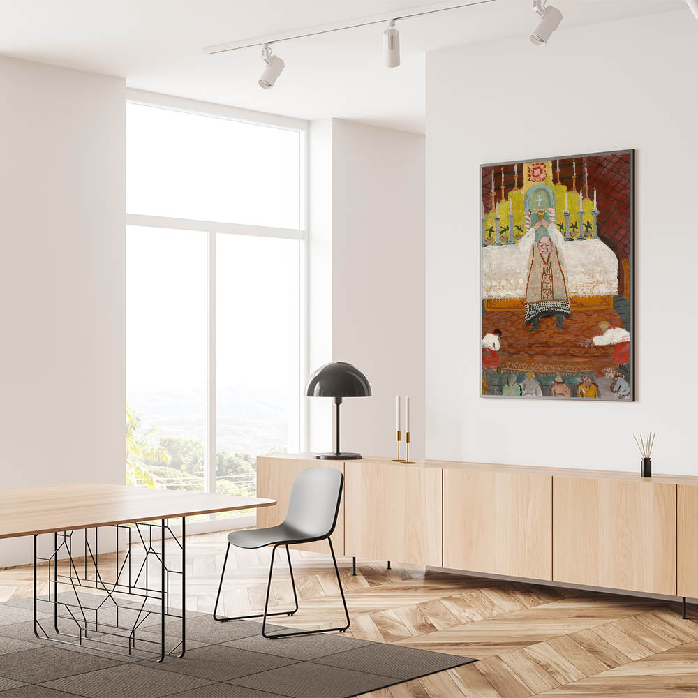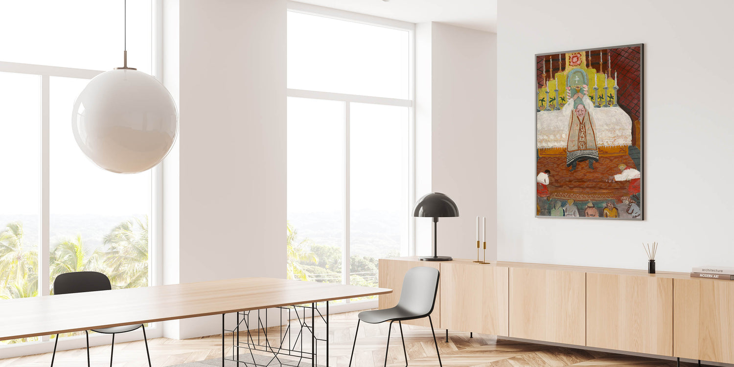 Explore the emotional depth of Expressionism with "Upheaval" by Cyprián Majerník. This striking piece captures a solemn yet vibrant scene of religious devotion, showcasing a priest holding a chalice during a moment of prayer. The rich, earthy tones and intricate details of the altar create a compelling visual narrative, bringing spiritual intensity to the forefront.