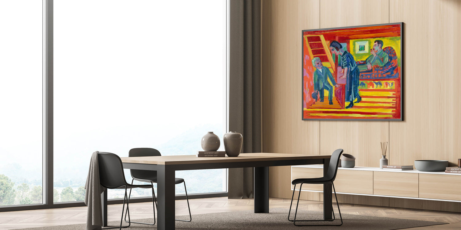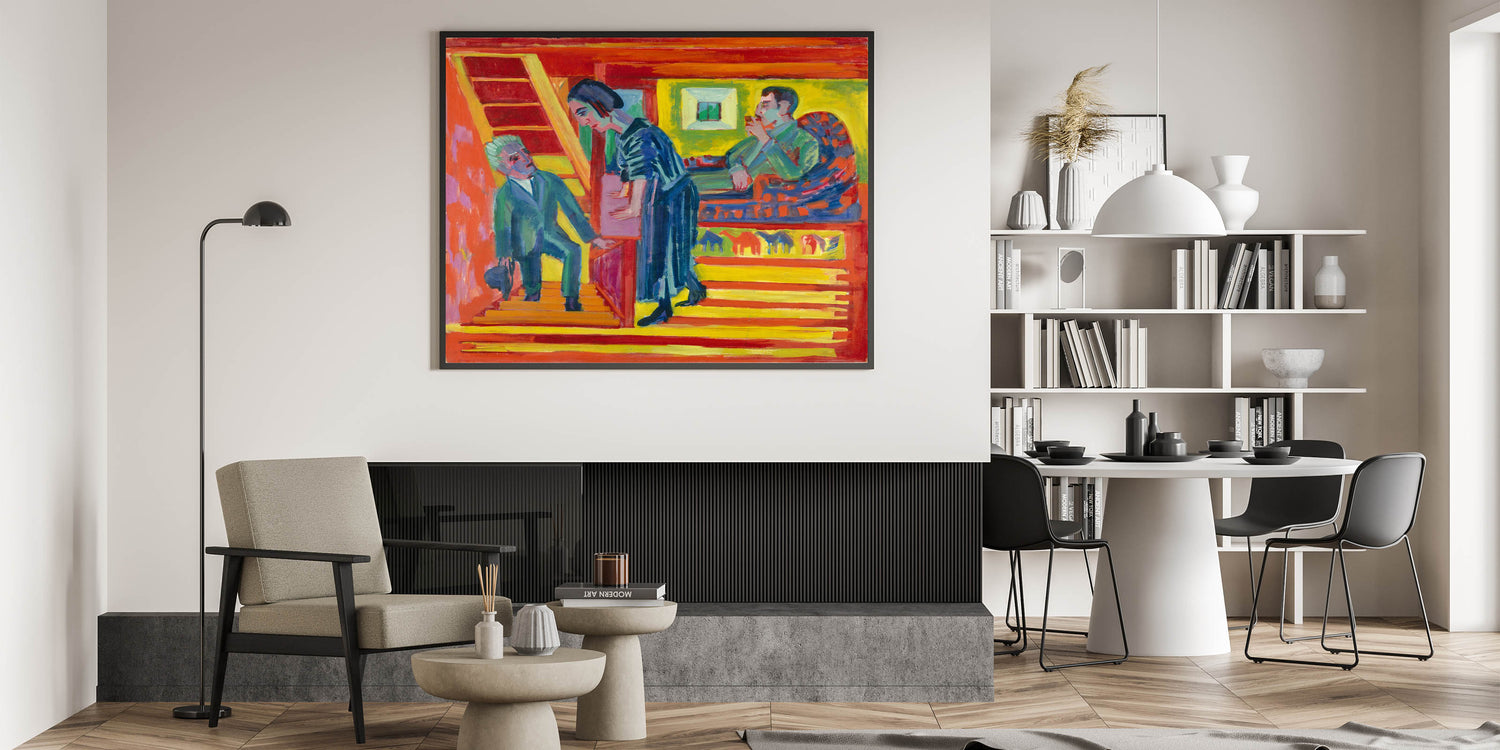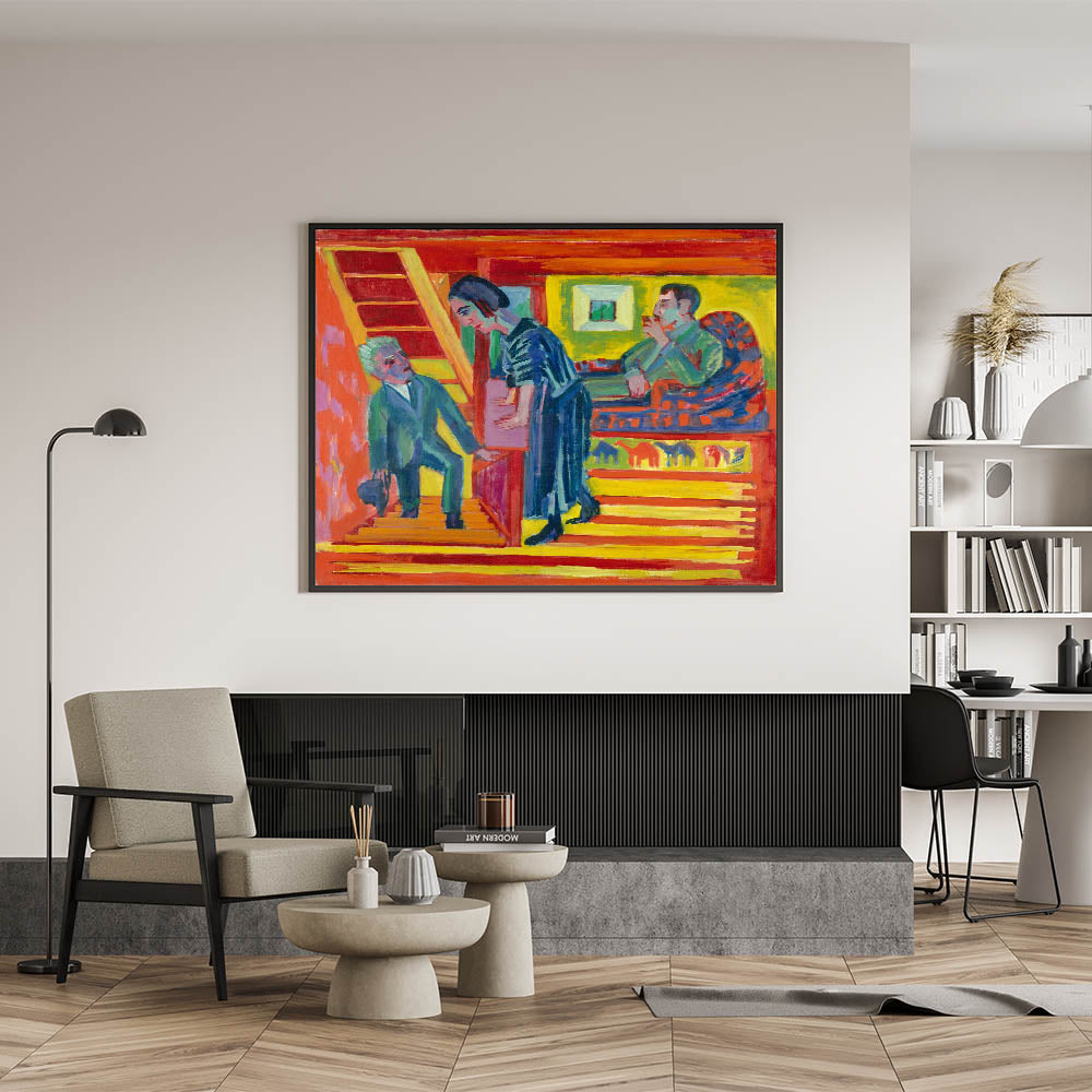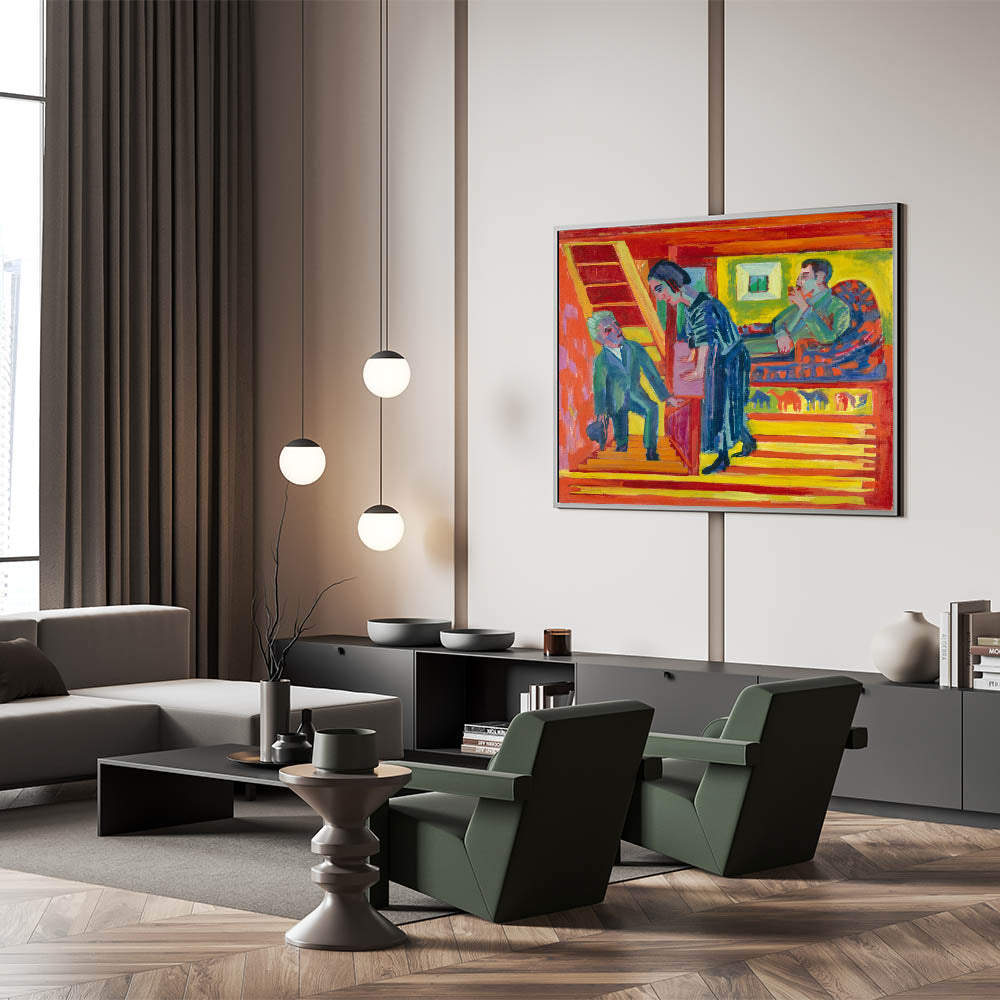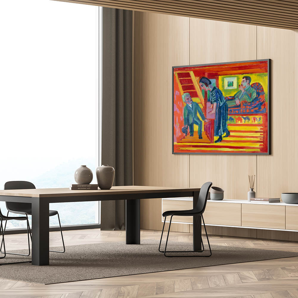 Immerse yourself in the vibrant world of Expressionist art with this stunning depiction of human interaction and emotion. This Expressionist Canvas Print showcases the essence of Modern Expressionism, characterized by bold colors, striking brushstrokes, and a dynamic composition that brings the scene to life.