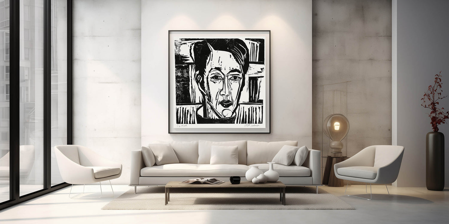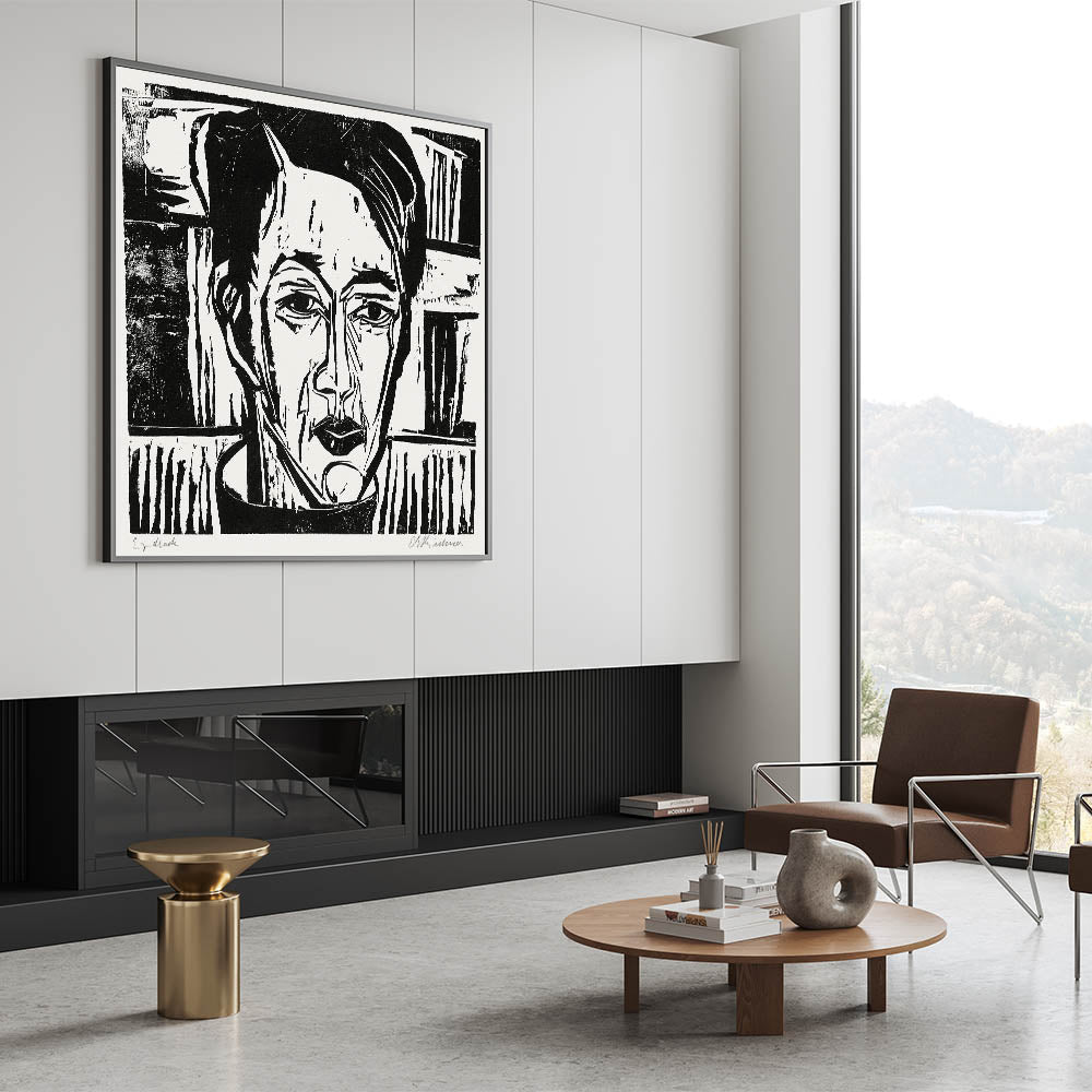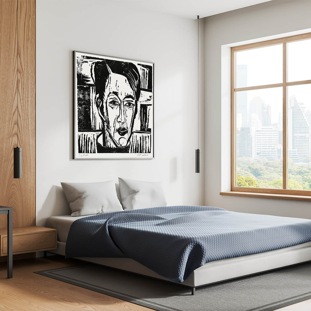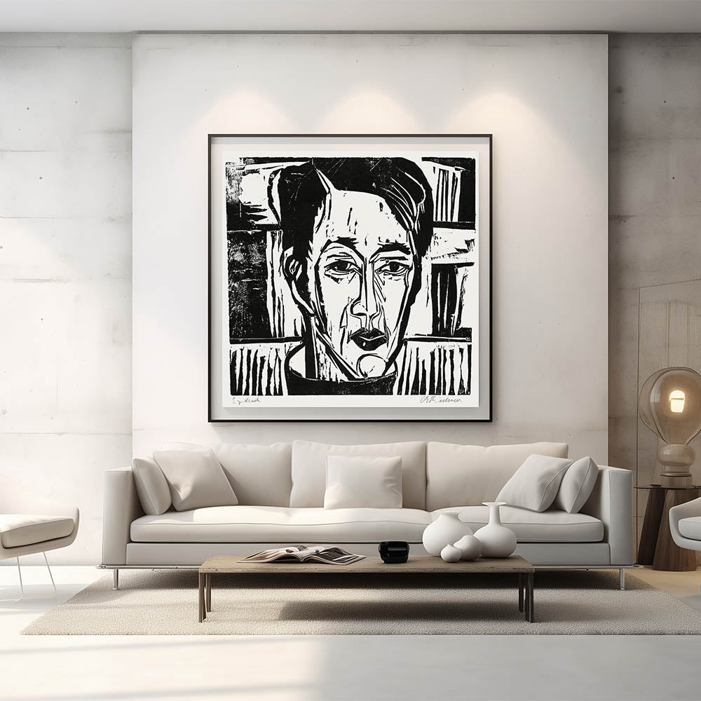 Introduce a striking piece of Expressionist history to your space with "Wehrlin, Facing Front," a bold woodcut print by renowned artist Ernst Ludwig Kirchner. This monochromatic portrait showcases Kirchner’s mastery of sharp lines and dynamic contrasts, capturing the raw intensity and emotional depth characteristic of Expressionism. The interplay of light and shadow in this artwork creates a compelling visual narrative, making it a centerpiece for modern and classic interiors alike.