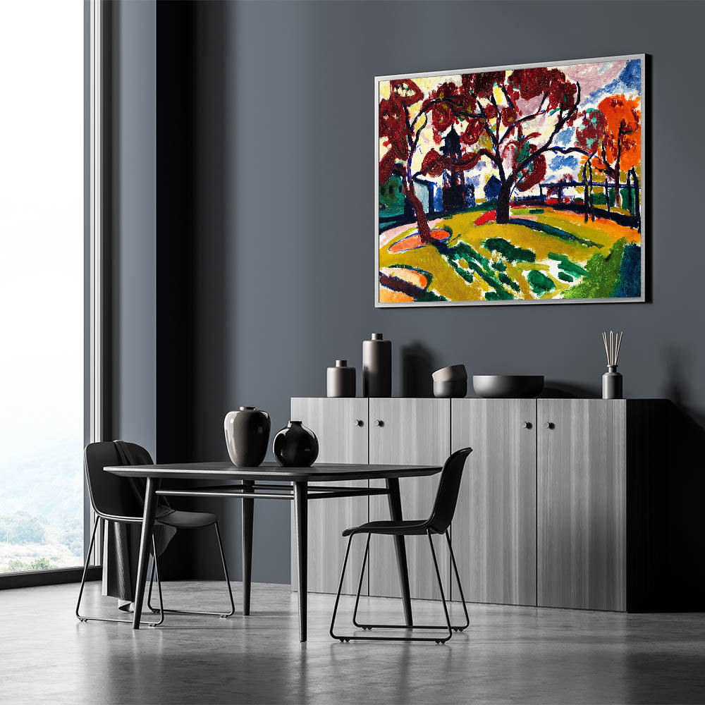 Bring the vibrant energy of nature into your home with "Winds," a breathtaking Expressionist landscape by Henry Lyman Sayen. This colorful masterpiece captures a dynamic interplay of swirling trees, bold shadows, and a radiant sky. The use of rich reds, greens, and yellows alongside bold brushstrokes evokes a sense of movement and vitality, making it an ideal statement piece for any space.