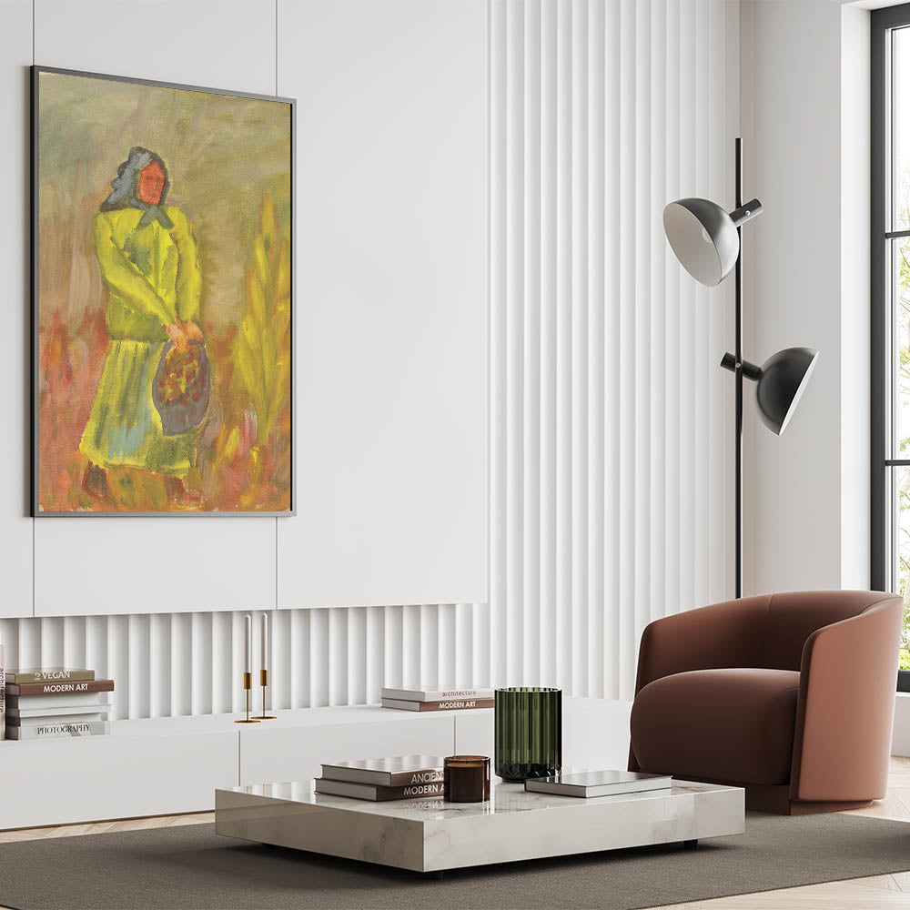 Celebrate the beauty of rural life with Woman with a Basket, a vivid Expressionist painting by Arnold Peter Weisz-Kubínčan. This Contemporary Expressionist Art piece showcases a woman in a radiant yellow dress, holding a basket filled with the colors of harvest. The warm hues and loose brushstrokes evoke the simplicity and charm of country life, making this artwork a perfect addition to any space that values warmth and authenticity.
