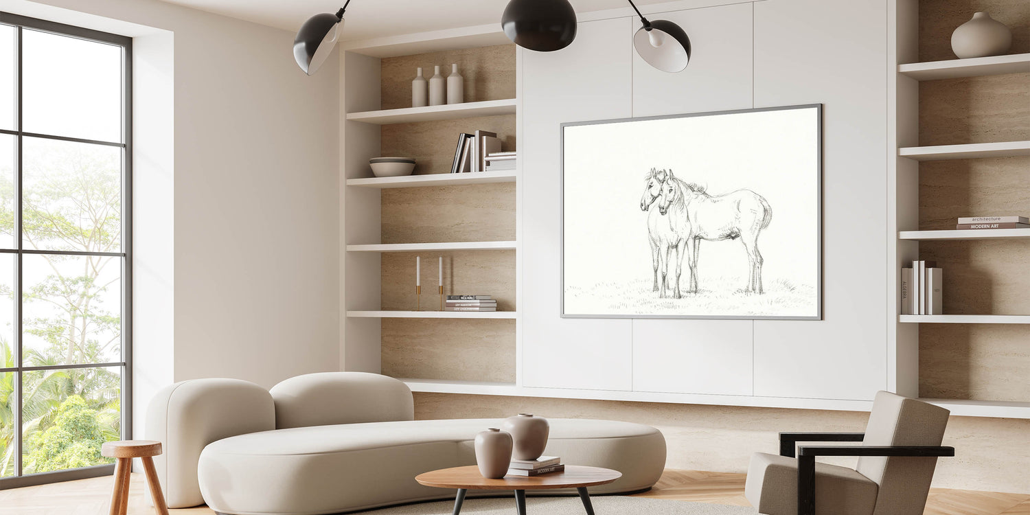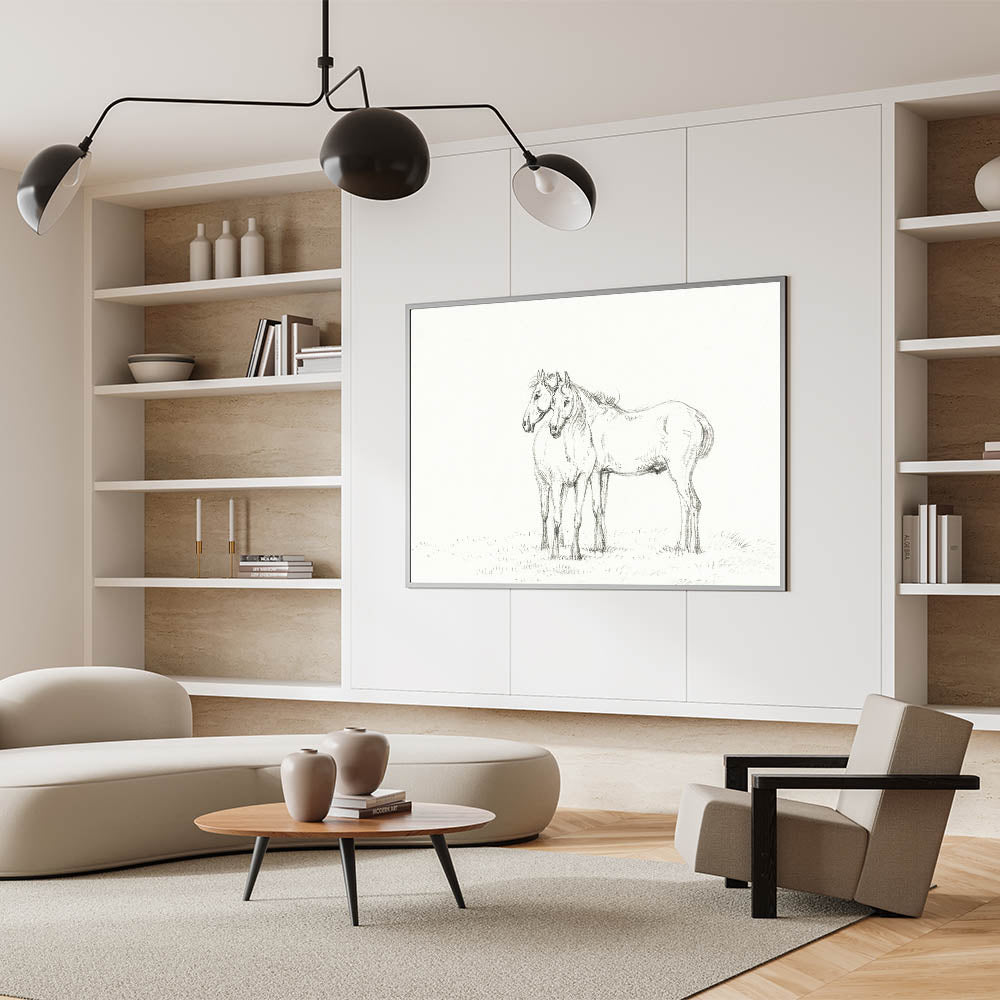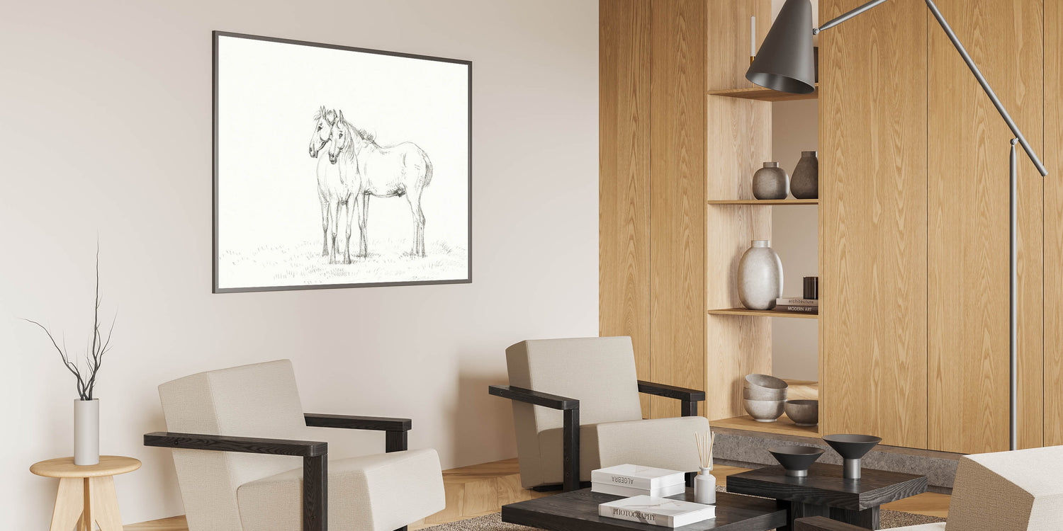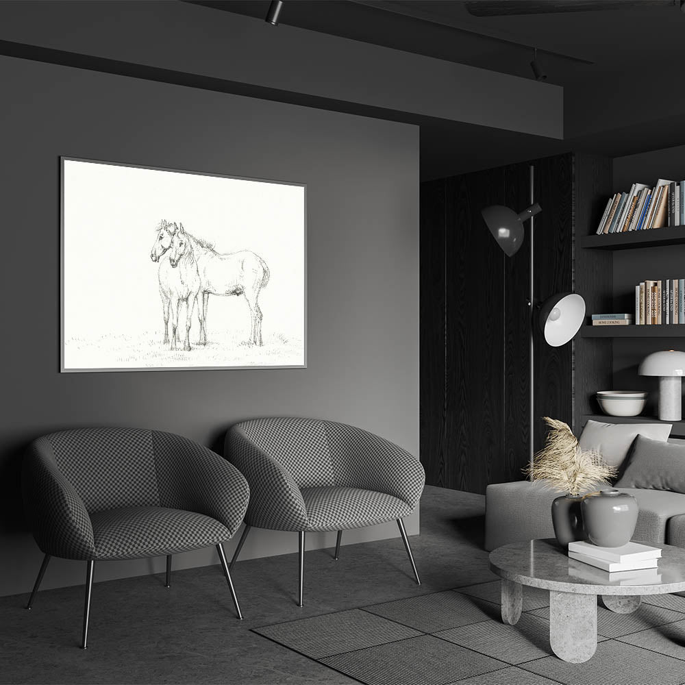 This beautiful Realism sketch, Two Horses Standing Together by Jean Bernard, captures a timeless moment of companionship between two horses in a minimalistic, detailed style. This fine art piece is perfect for equestrian enthusiasts and those who appreciate the subtle beauty of pencil sketches. The simplicity of the lines and the realistic portrayal of the horses add a touch of elegance to any room, making it a versatile addition to both classic and modern decor.