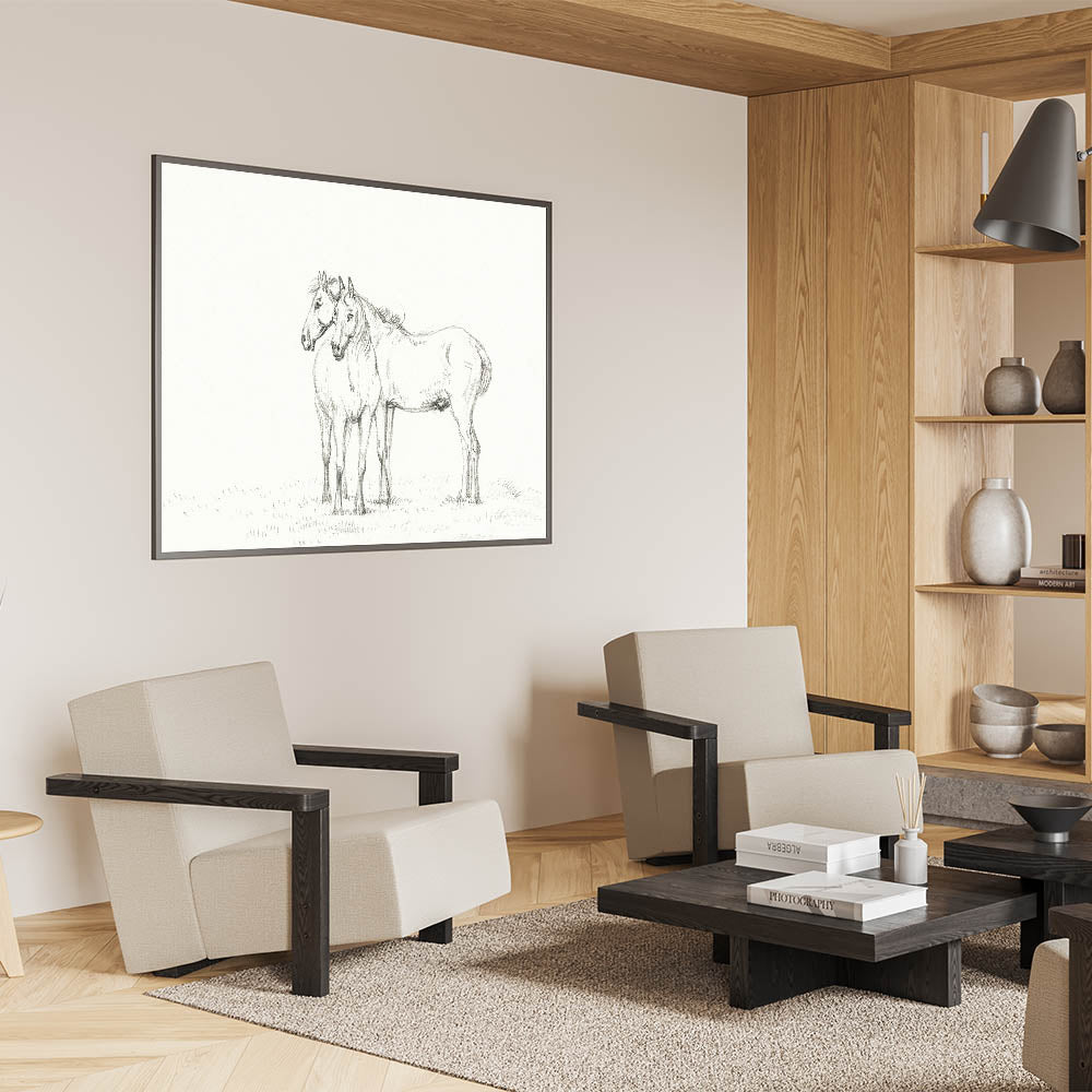 Fine Art Realism Sketch - Two Horses Standing Together Art Print Canvas