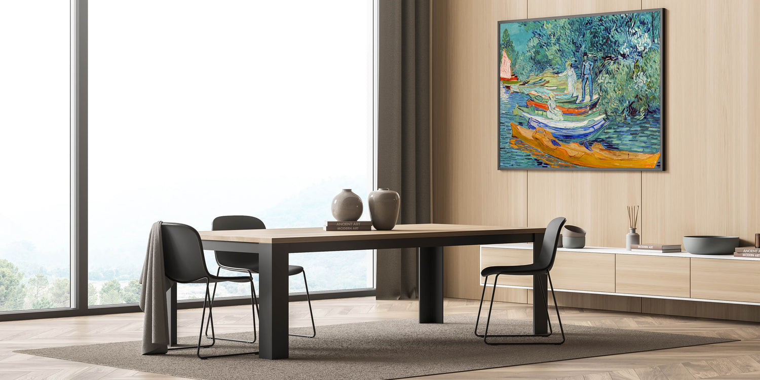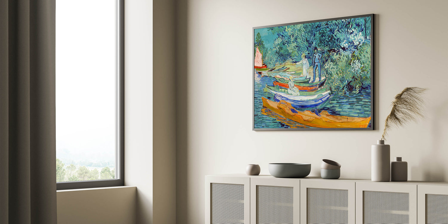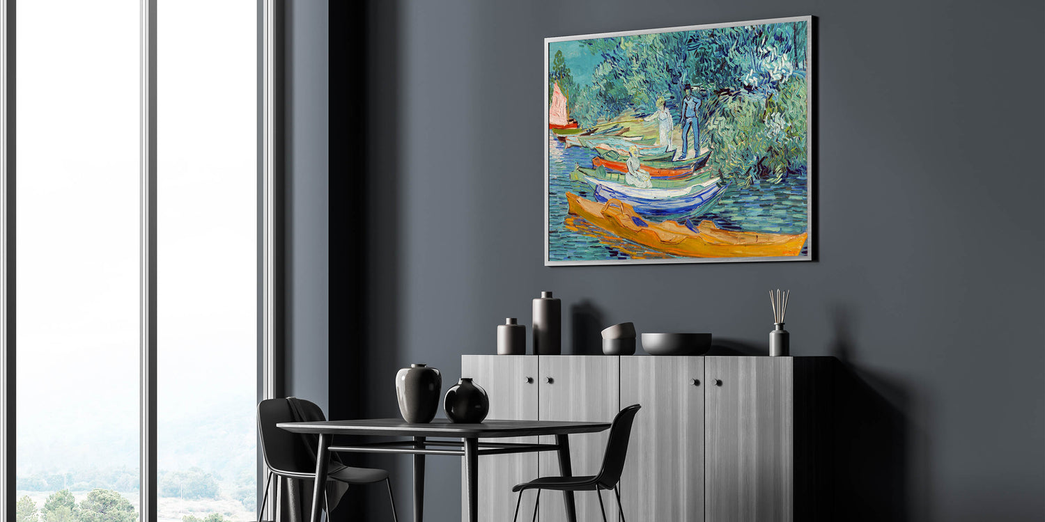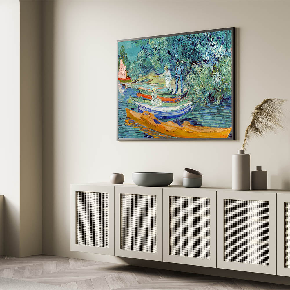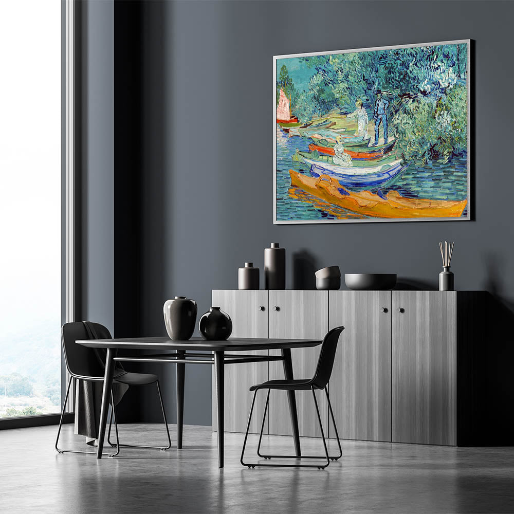 Capture the vibrant energy of French Impressionist art with Vincent van Gogh's Bank of the Oise at Auvers (1890). This Impressionism wall art celebrates Van Gogh's mastery of color and movement, showcasing a serene riverside scene with boats and lush greenery. The dynamic brushstrokes and striking hues of blue, green, and orange make this piece an exquisite centerpiece for any space.
