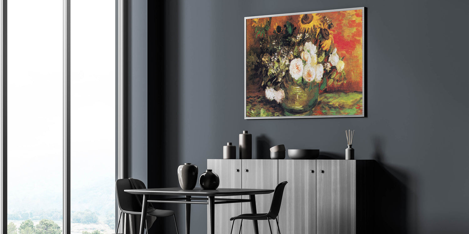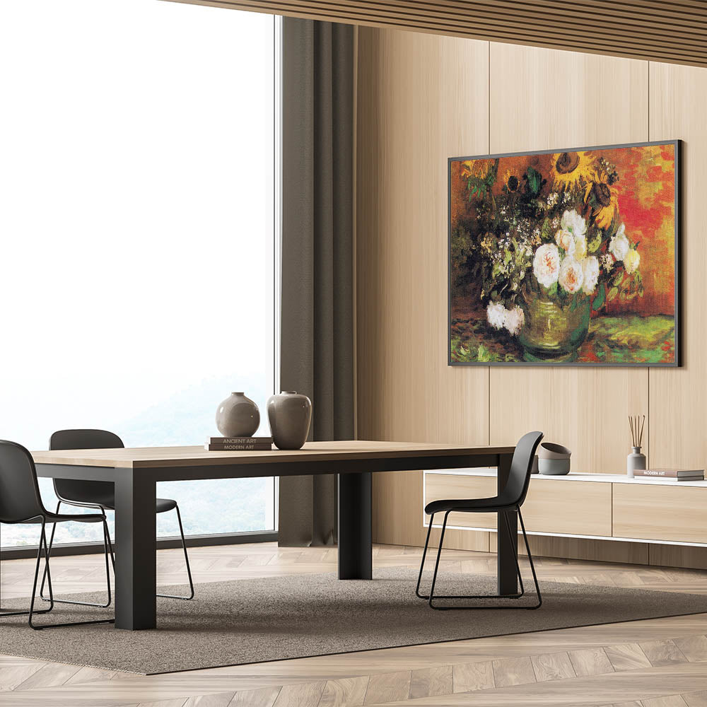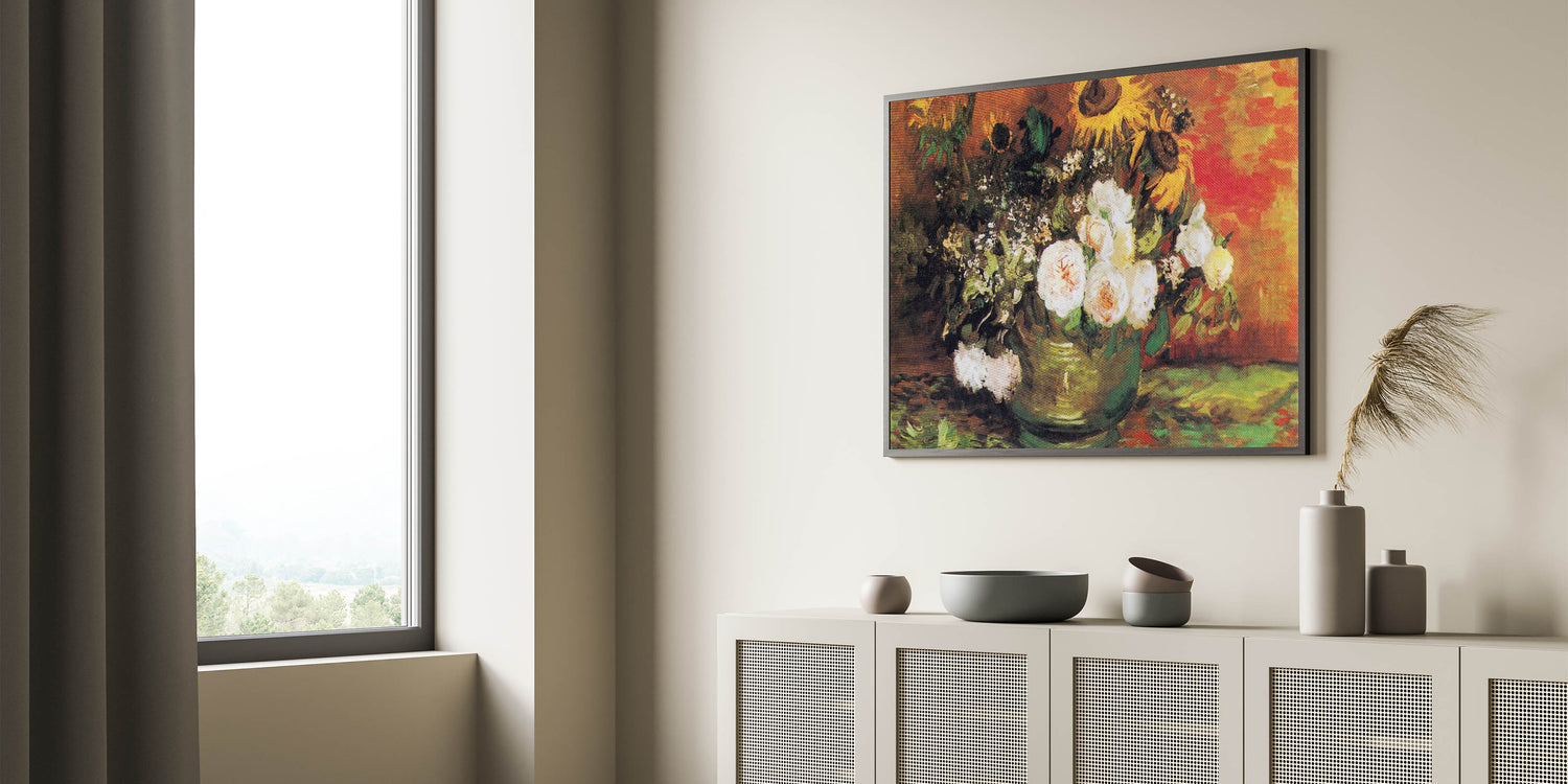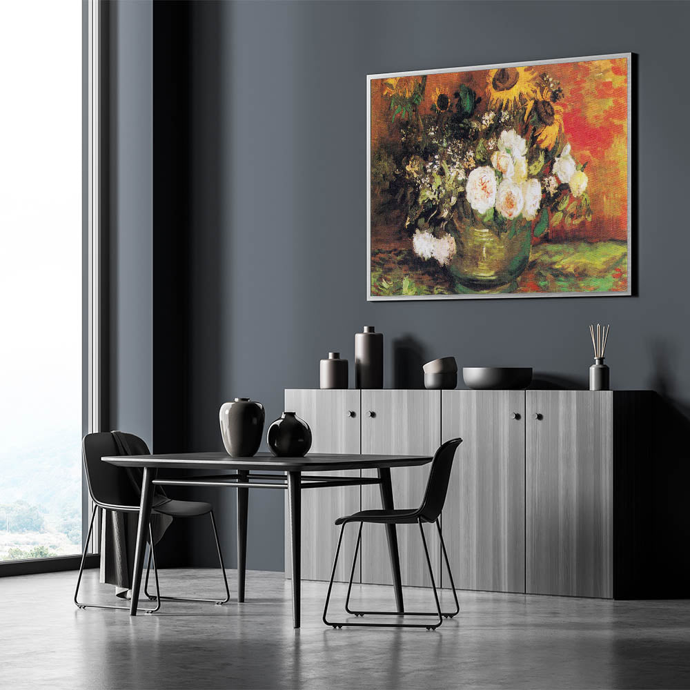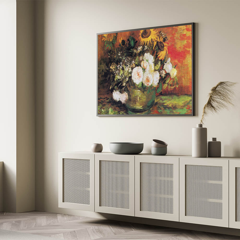 Brighten your space with Vincent van Gogh's Bowl with Sunflowers, Roses, and Other Flowers (1886), a masterpiece of Impressionist paintings. This stunning artwork features a vibrant arrangement of sunflowers, roses, and greenery, set against a rich, warm background. The expressive brushstrokes and harmonious blend of bold and subtle tones make this Impressionism wall art a timeless choice for art enthusiasts.