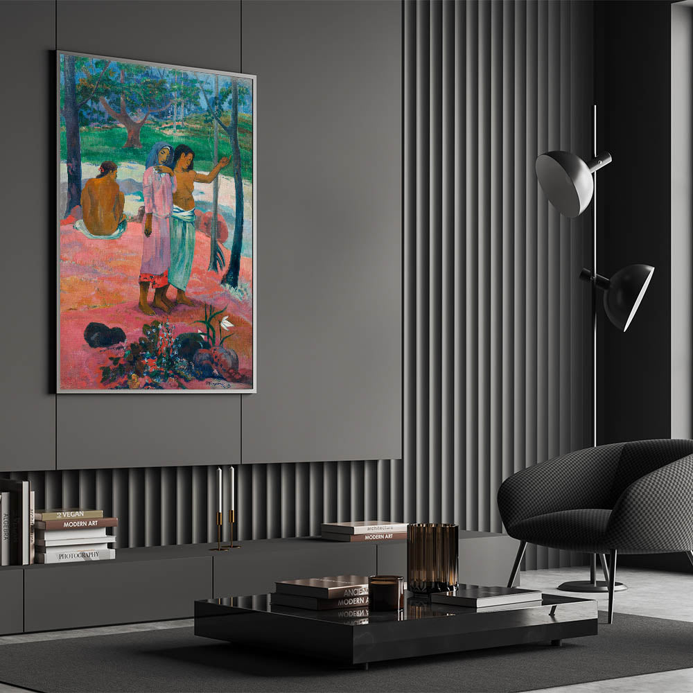 Transport yourself to a serene tropical landscape with Paul Gauguin's "The Call." This Post-Impressionist masterpiece exudes vibrant colors and a captivating composition, featuring figures immersed in a tranquil, natural setting. Gauguin's bold use of pinks, greens, and blues creates a harmonious palette that reflects the lush beauty of the tropics. The figures' expressive poses and the interplay of light and shadow make this artwork a profound exploration of connection and place. Perfect for lovers of Post-Impressionist art, this piece adds warmth and intrigue to any room.