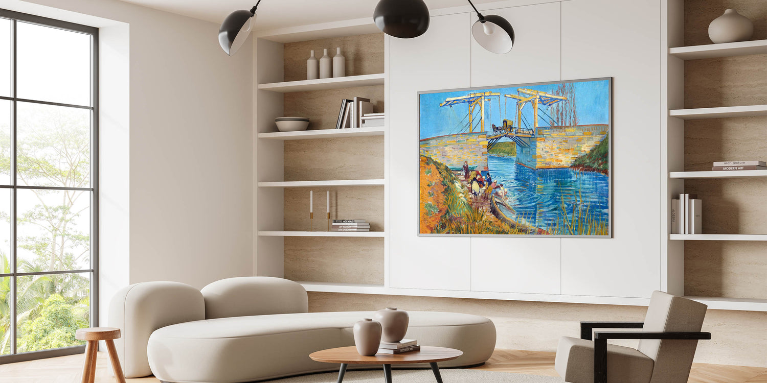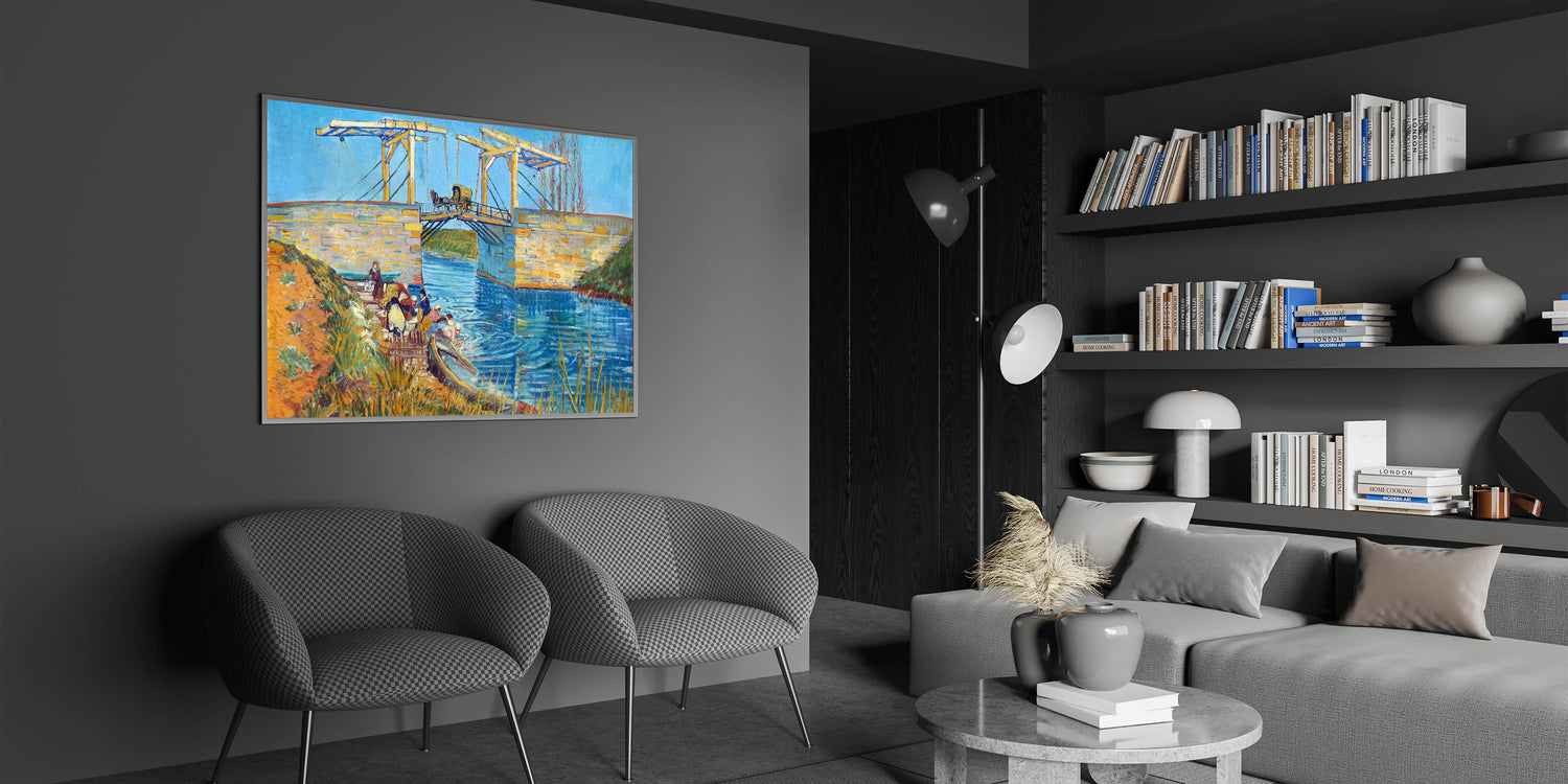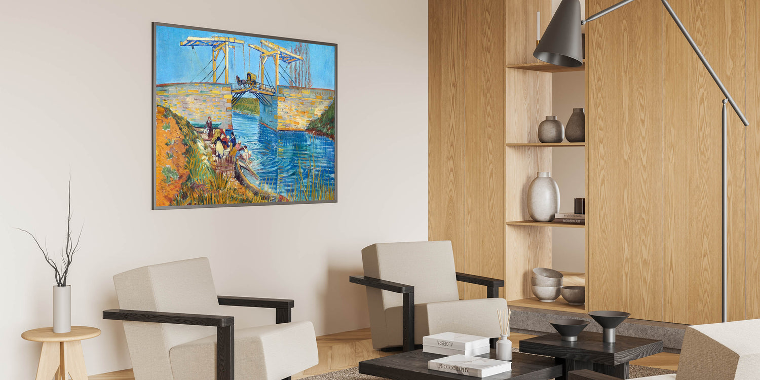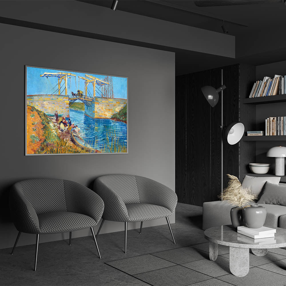 Celebrate the charm of rural life with Vincent van Gogh's "The Langlois Bridge at Arles with Women Washing" (1888). This vibrant Impressionist painting captures the everyday activities along a picturesque canal, featuring women washing clothes by the water and a cart crossing the iconic Langlois Bridge. The rich color palette of bright blues, warm yellows, and earthy tones makes this piece a lively addition to any decor.
