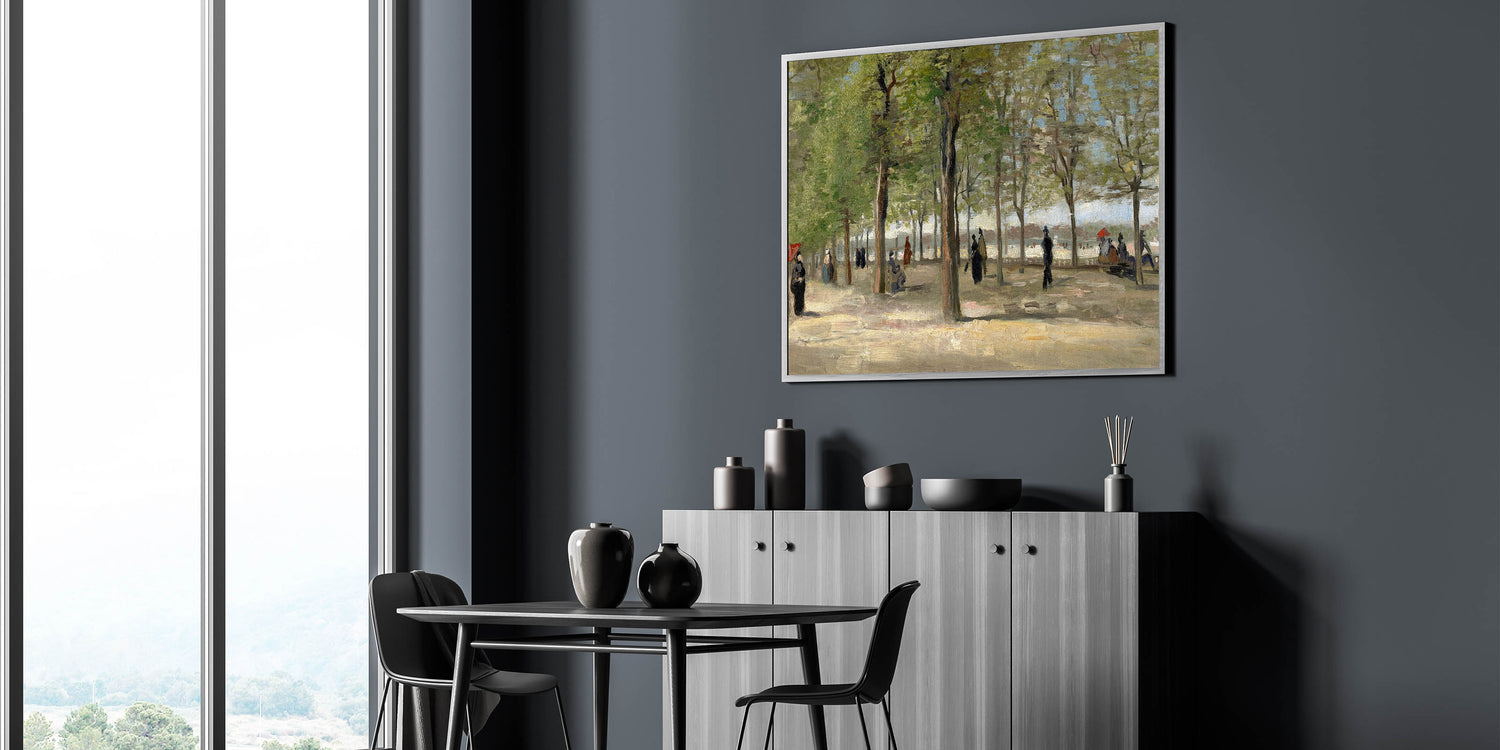 Capture the quiet elegance of Parisian life with Vincent van Gogh's "Terrace in the Luxembourg Gardens" (1886). This Impressionist masterpiece portrays a serene park scene filled with strolling figures, lush greenery, and soft, diffused light. Van Gogh’s delicate brushwork and muted tones create a calming atmosphere, perfect for any home or office decor.