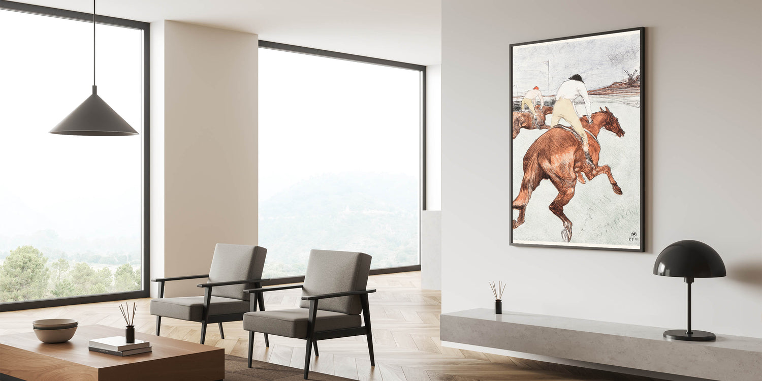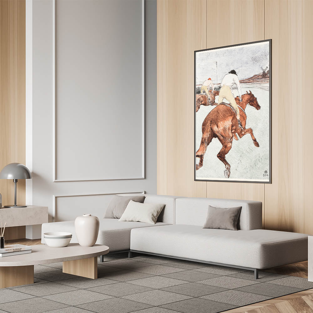 Bring the thrill of the racetrack into your space with "The Jockey" by Henri de Toulouse-Lautrec. This striking Impressionist artwork captures the energy and motion of horse racing with dynamic lines and rich, earthy tones. The carefully crafted details of the jockeys and horses create a sense of movement, while the soft background evokes a serene yet lively atmosphere.