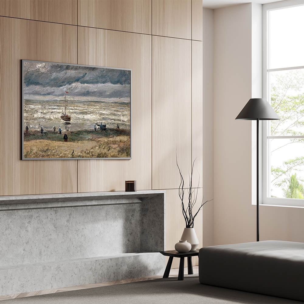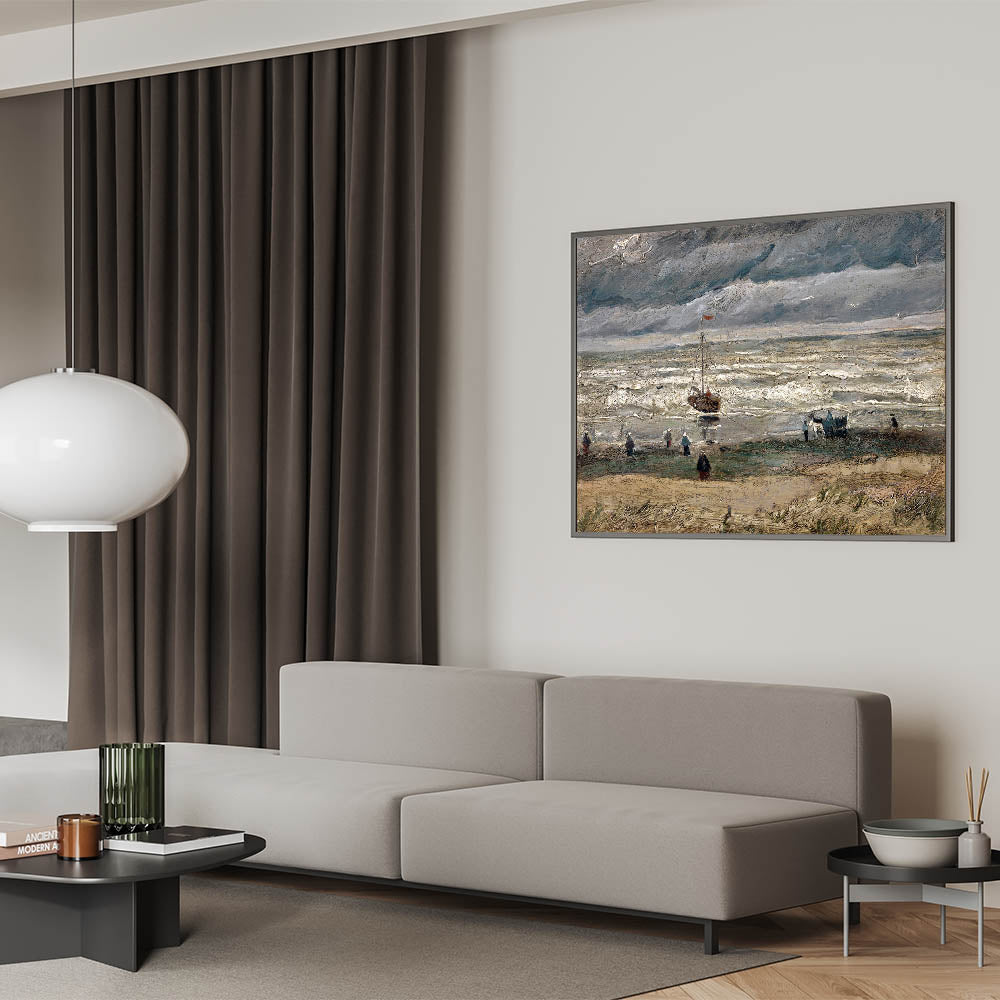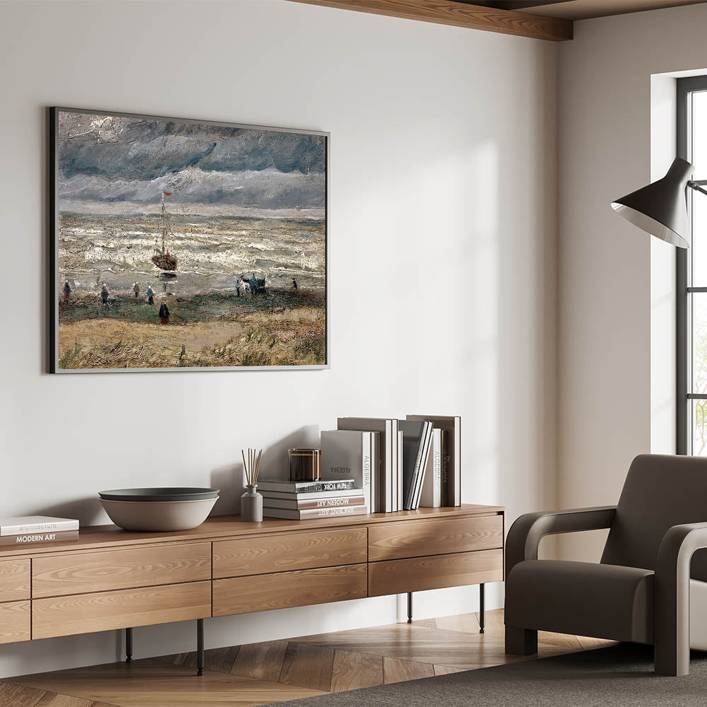 Immerse yourself in the dramatic beauty of Vincent van Gogh's Beach at Scheveningen in Stormy Weather (1882), a stunning example of Impressionist landscape art. This Impressionism wall art captures the raw power of nature with its turbulent skies, rolling waves, and figures along the beach. Van Gogh's expressive brushstrokes and moody palette convey a sense of movement and emotion that is truly captivating.
