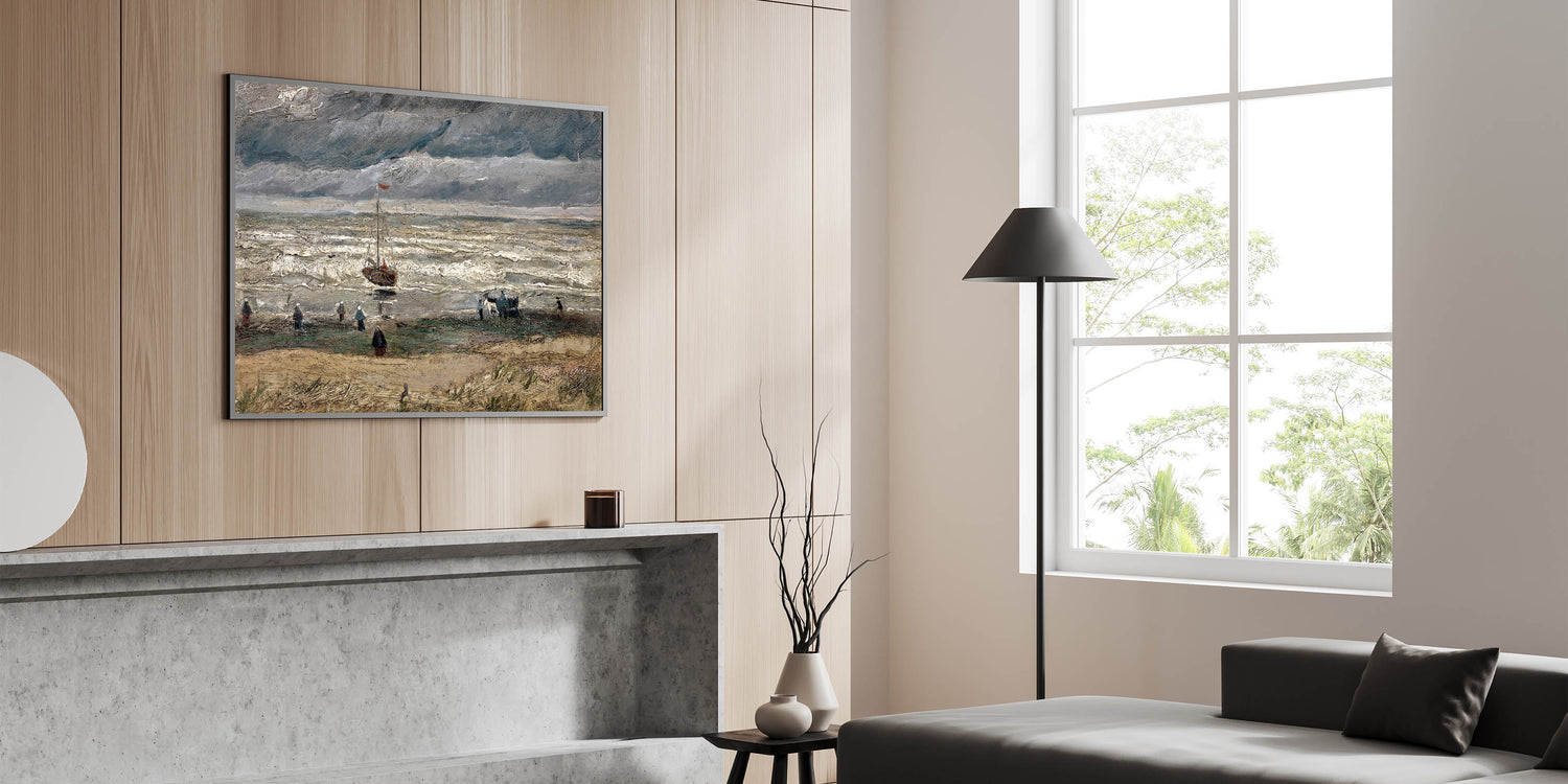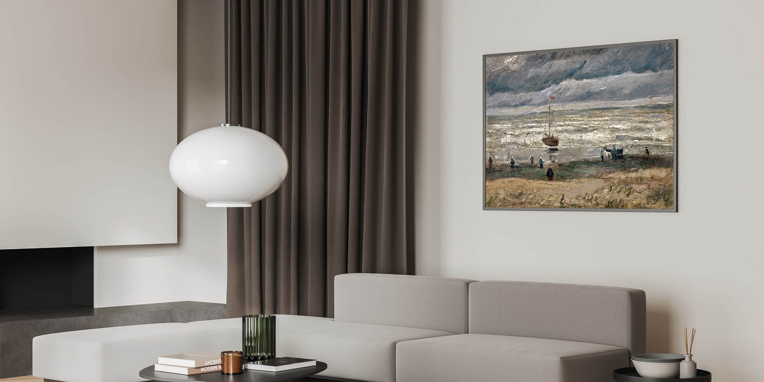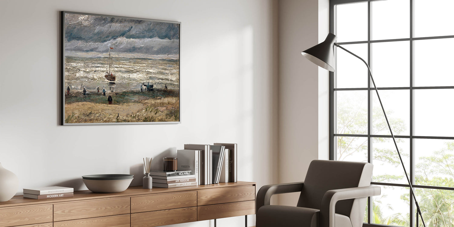Immerse yourself in the dramatic beauty of Vincent van Gogh's Beach at Scheveningen in Stormy Weather (1882), a stunning example of Impressionist landscape art. This Impressionism wall art captures the raw power of nature with its turbulent skies, rolling waves, and figures along the beach. Van Gogh's expressive brushstrokes and moody palette convey a sense of movement and emotion that is truly captivating.