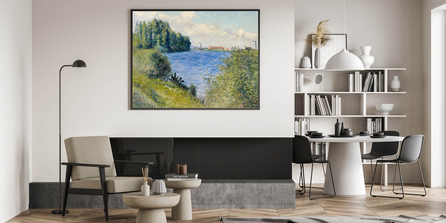 Transform your space with Gustave Caillebotte’s "The Seine at Argenteuil," a stunning Impressionist painting from around 1892. This artwork beautifully captures the tranquil flow of the Seine River, framed by lush greenery and a peaceful village in the distance. Caillebotte’s masterful use of light and texture conveys the serene charm of the French countryside.