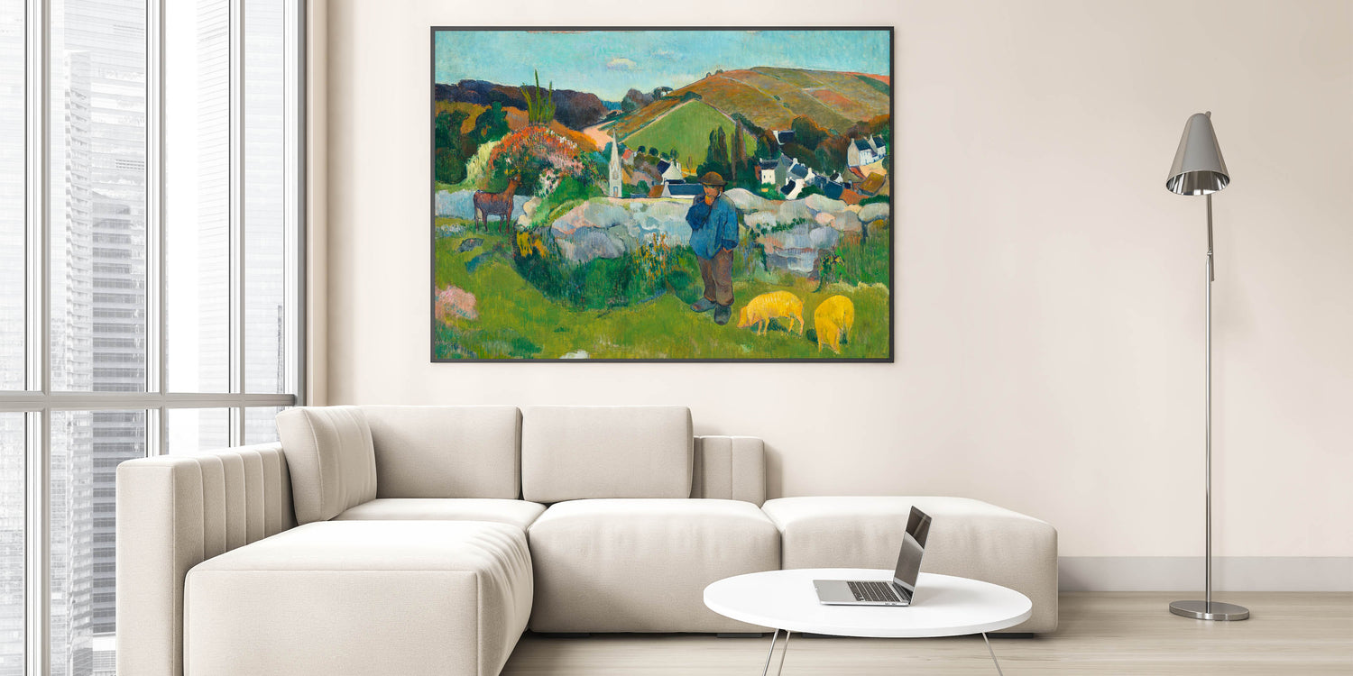 Transform your space with Paul Gauguin’s "The Swineherd," a masterful Impressionist painting created in 1888. This vibrant artwork captures a pastoral scene in Brittany, featuring a contemplative swineherd amidst lush greenery, rolling hills, and vibrant village life. Gauguin’s bold colors and fluid forms evoke a sense of simplicity and harmony with nature, making this piece a timeless addition to any collection.