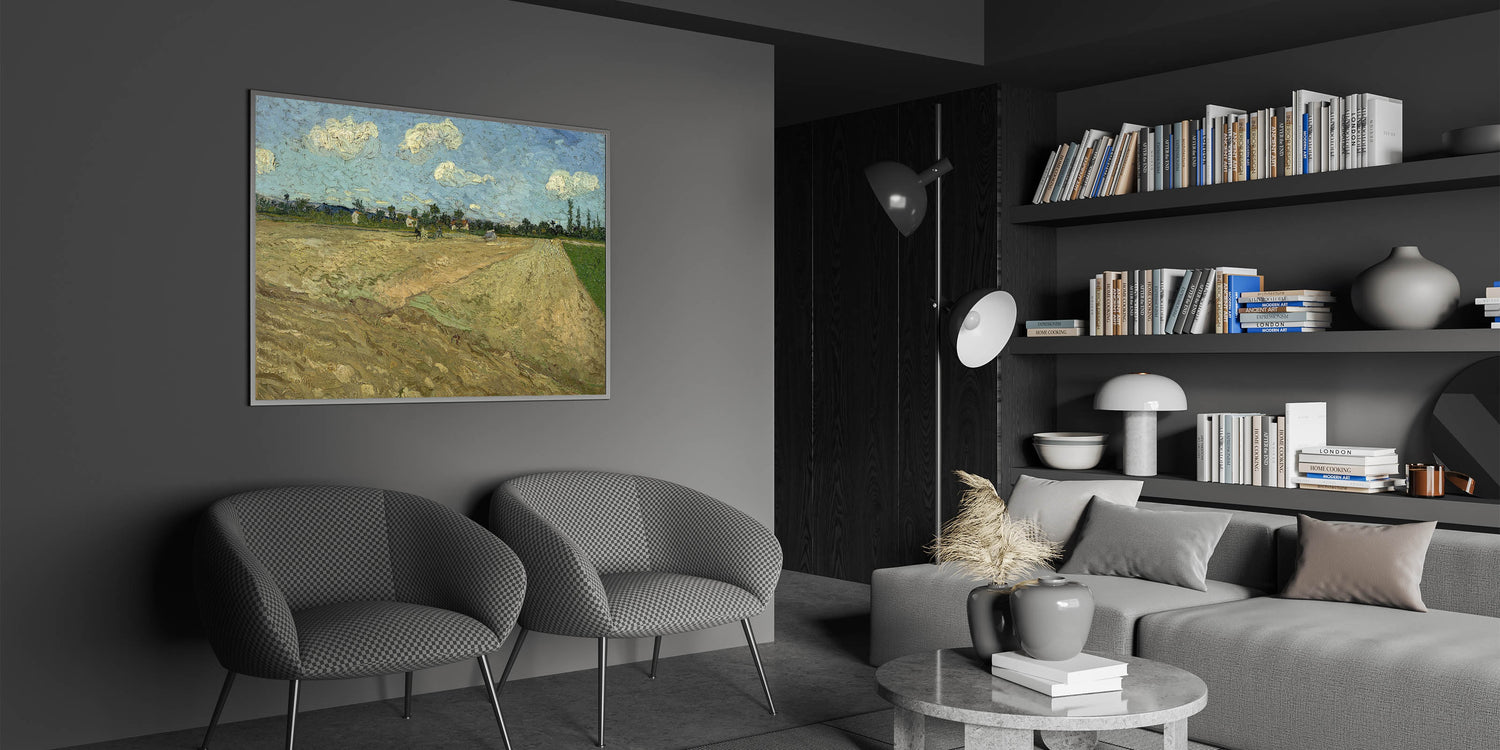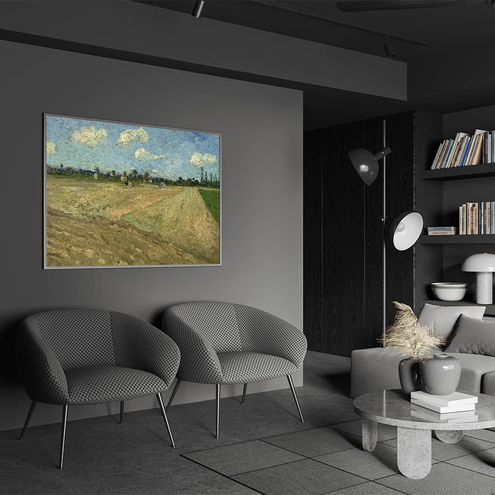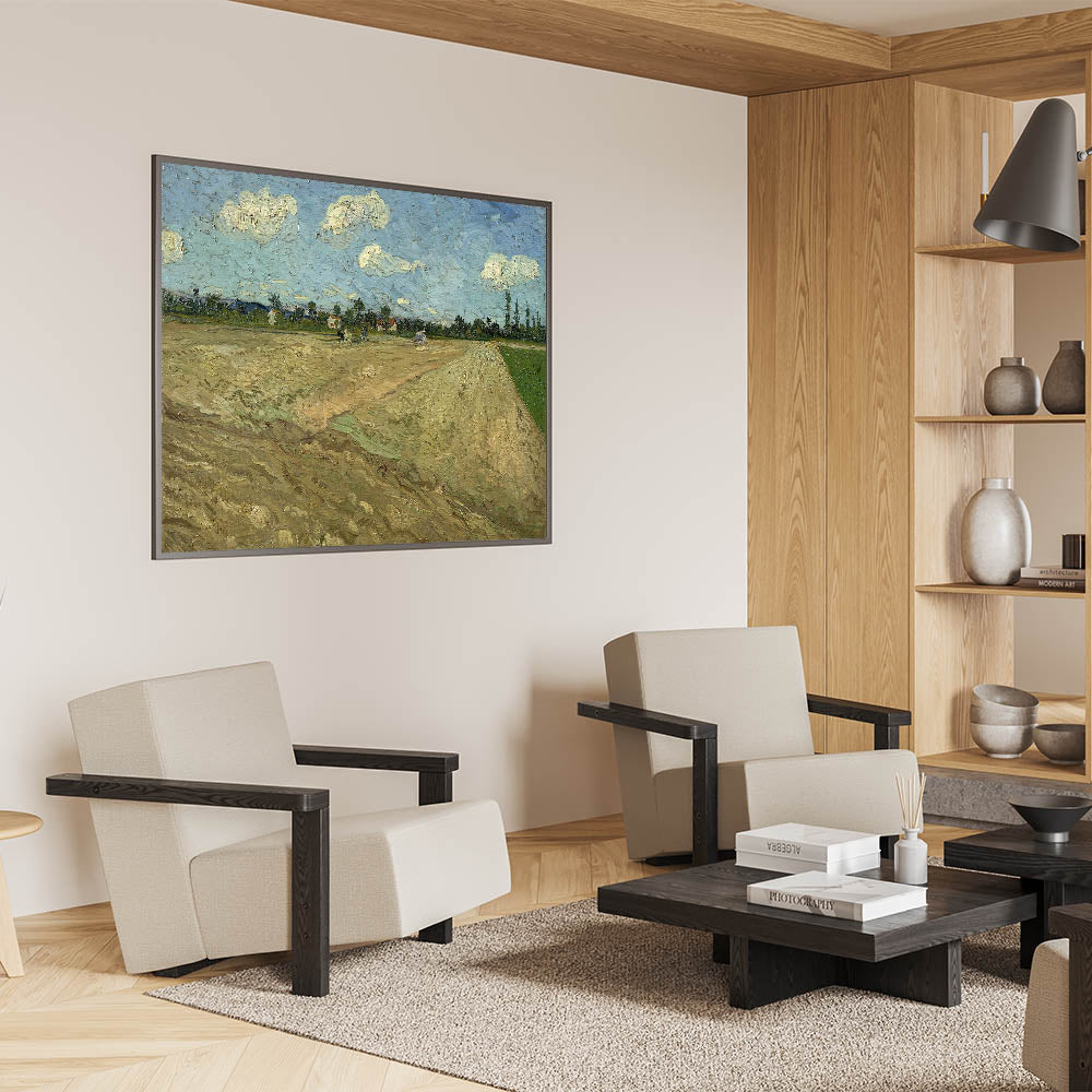 Experience the tranquility of the countryside with this Impressionist wall art inspired by Vincent van Gogh’s "Ploughed Fields." This stunning painting depicts a serene rural landscape under a vibrant blue sky, with textured fields stretching into the distance. The expressive brushstrokes and earthy tones evoke a sense of calm and connection to nature, making it a perfect addition to your home decor.