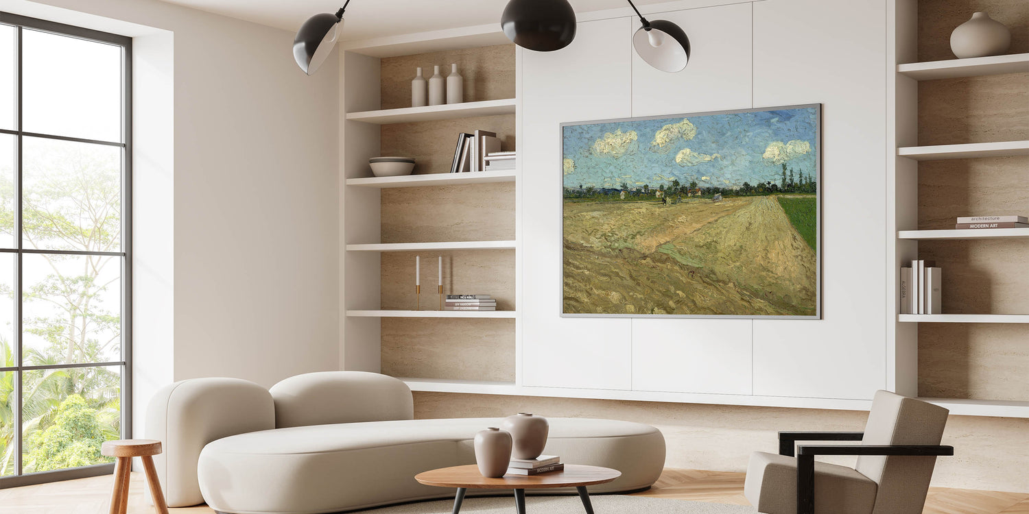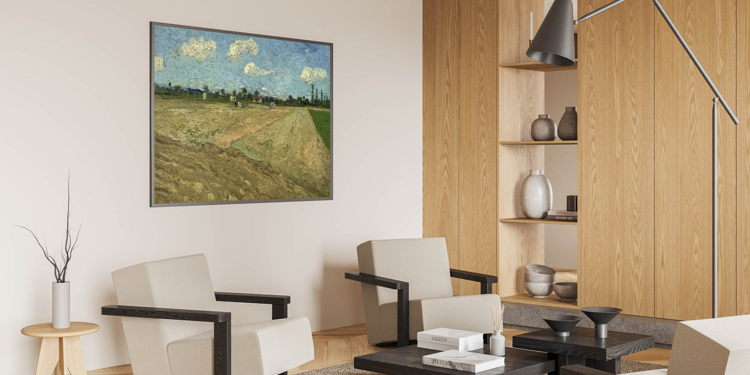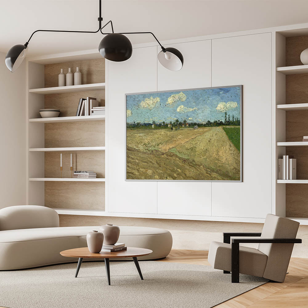 Experience the tranquility of the countryside with this Impressionist wall art inspired by Vincent van Gogh’s "Ploughed Fields." This stunning painting depicts a serene rural landscape under a vibrant blue sky, with textured fields stretching into the distance. The expressive brushstrokes and earthy tones evoke a sense of calm and connection to nature, making it a perfect addition to your home decor.