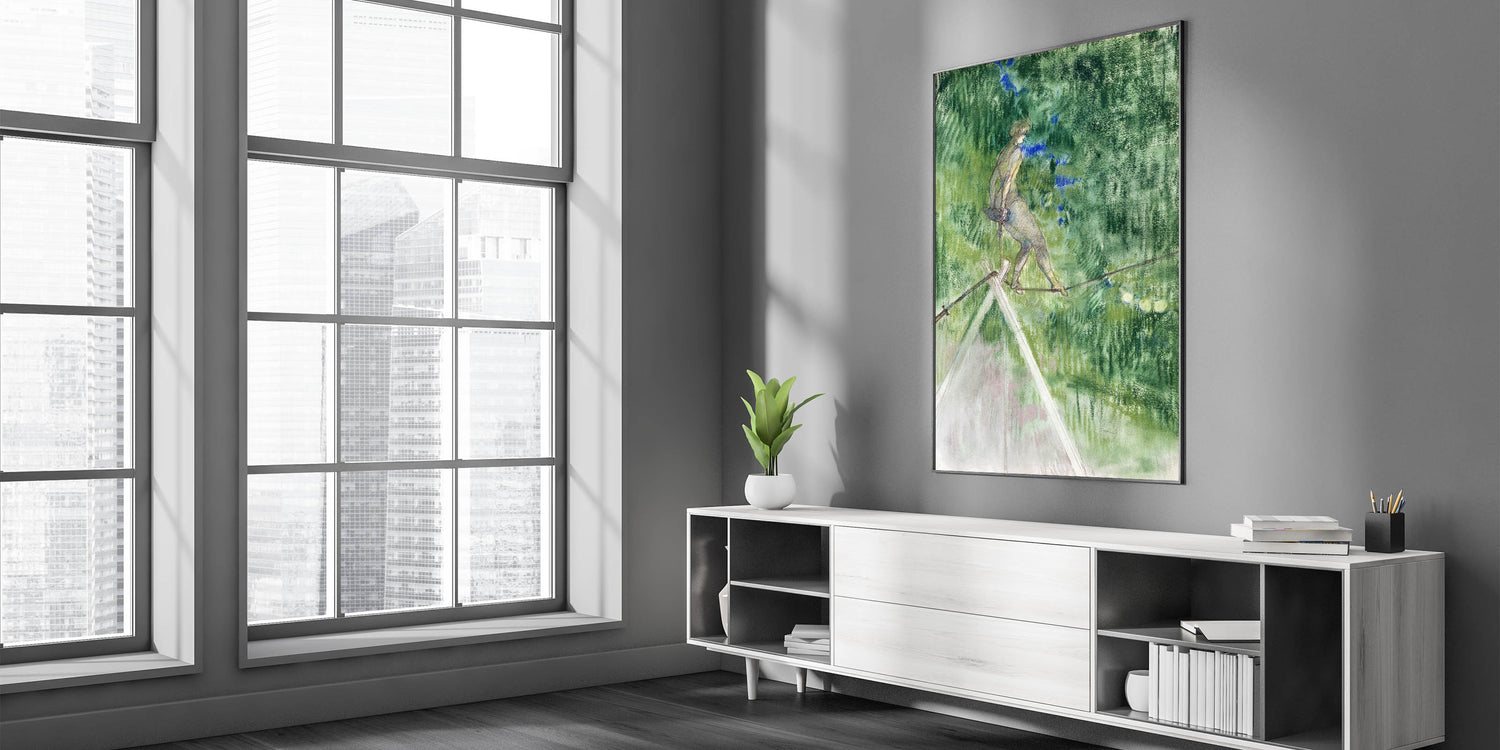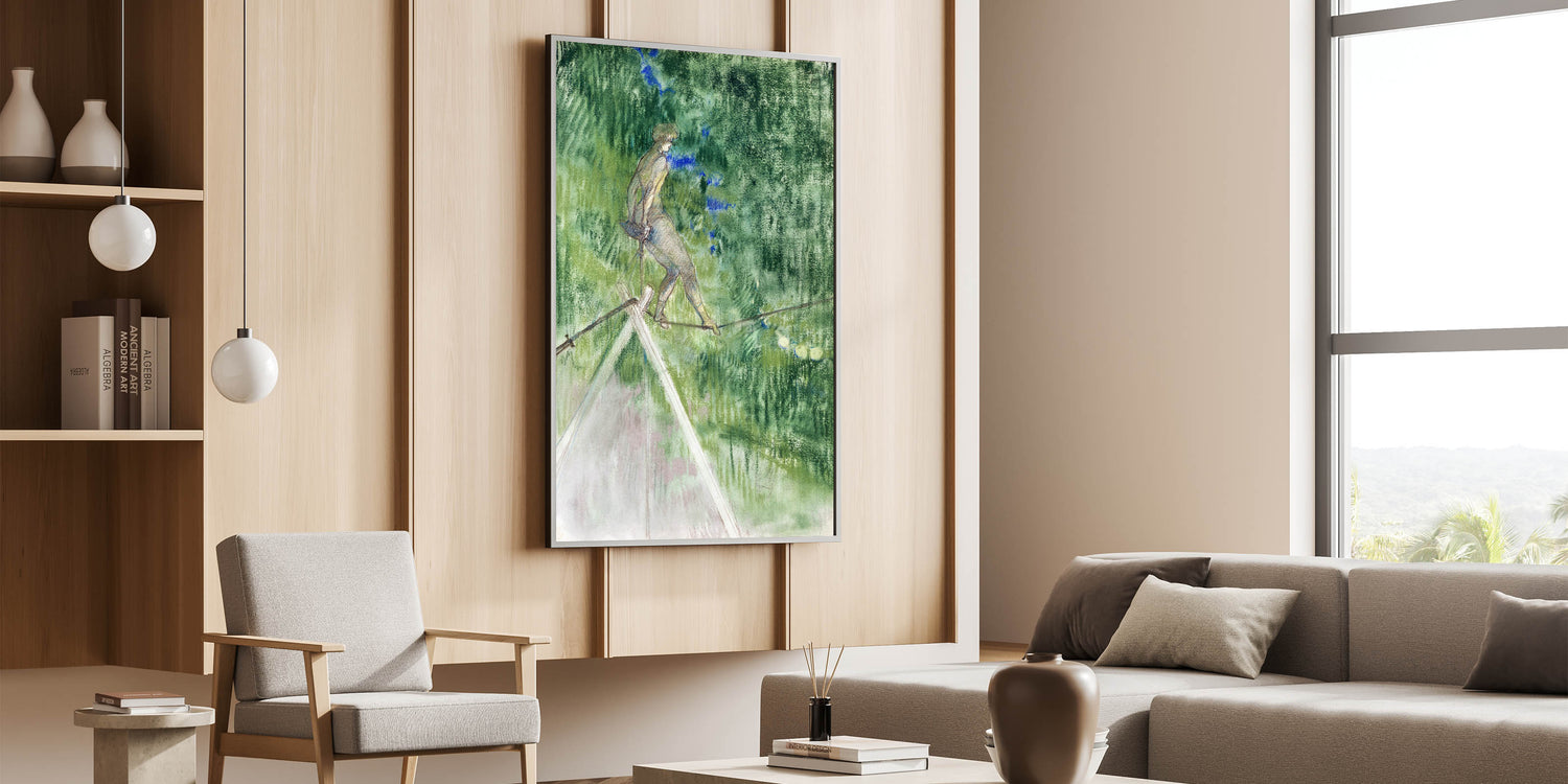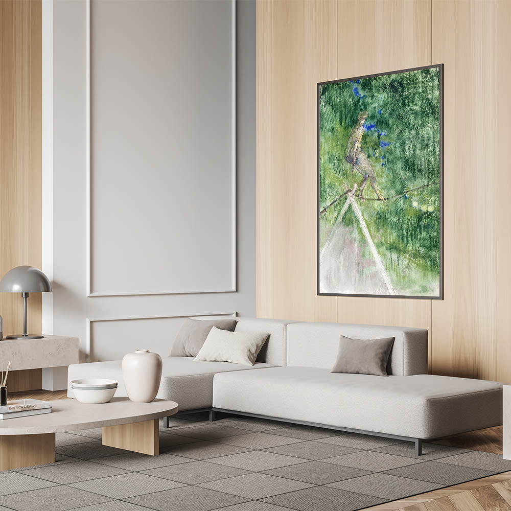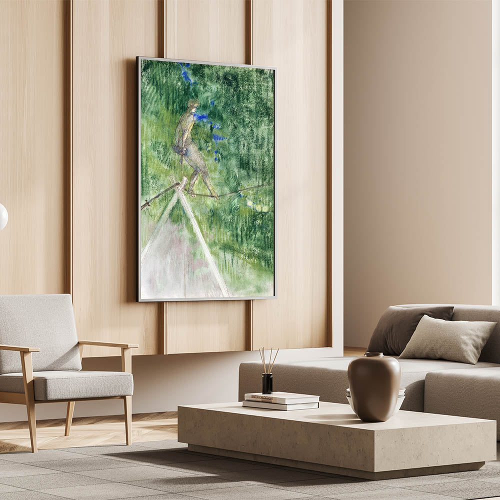 Step into the world of elegance and daring with "The Rope Dancer" by Henri de Toulouse-Lautrec. This captivating Impressionist artwork portrays a high-wire performer gracefully balancing above a vibrant, lush background of greens and blues. Toulouse-Lautrec masterfully uses delicate textures and dynamic lines to capture the tension and artistry of the scene, making it a stunning piece for any art collection.