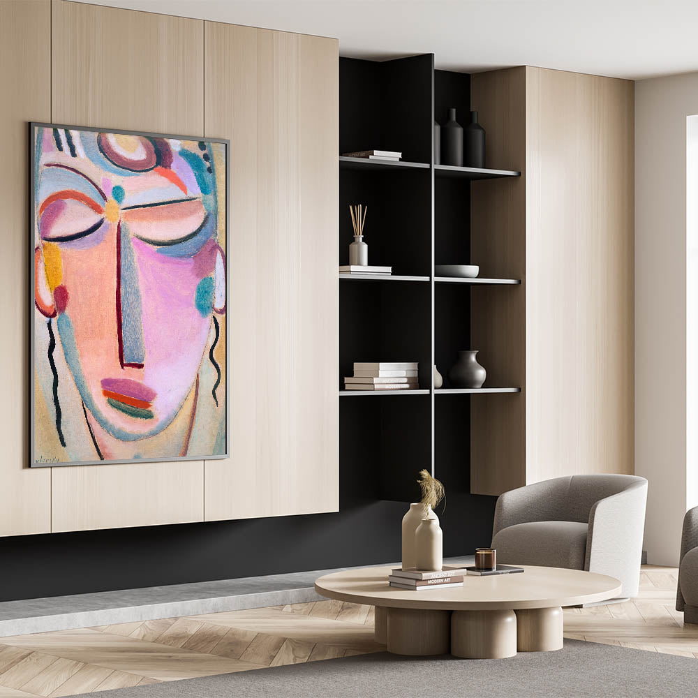 Immerse yourself in the rich colors and spiritual depth of Alexej von Jawlensky's "Meditation" (1918). This Expressionist masterpiece blends vivid hues of pink, orange, and blue with bold black outlines to create a serene and abstract portrait. The closed eyes and soft features convey a sense of inner peace, making this artwork a perfect representation of Jawlensky's exploration of emotion and spirituality through color and form.