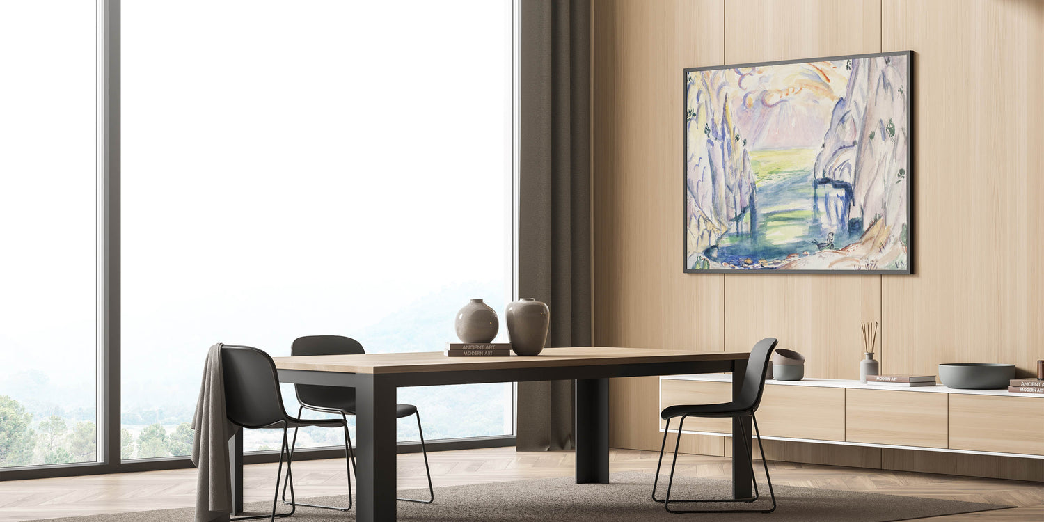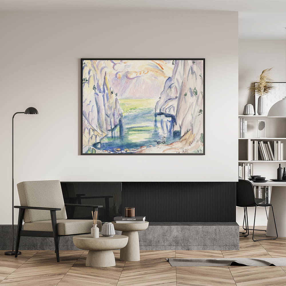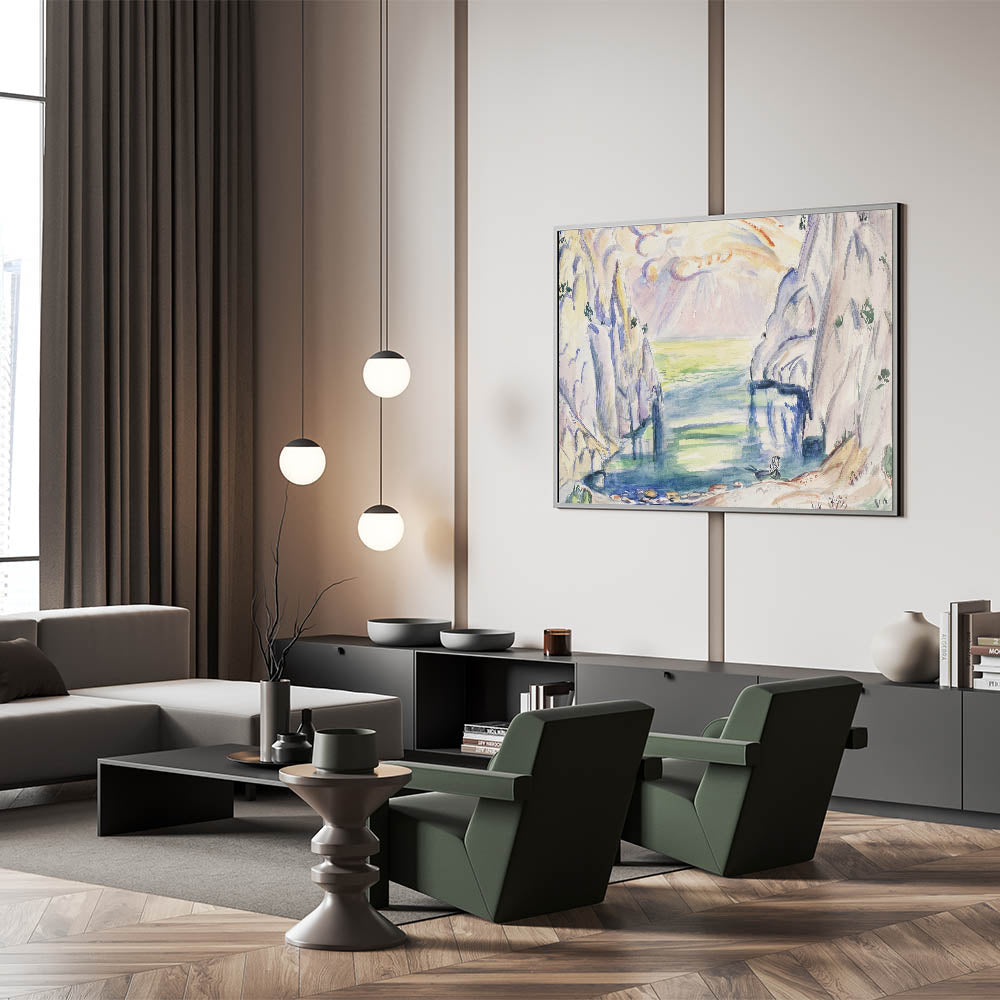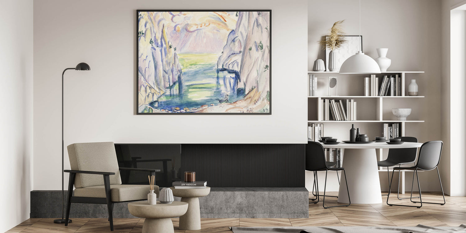 Transform your space with this stunning "Modern Cove Art," a captivating seascape inspired by nature’s serenity. This contemporary artwork brings together gentle hues of blue, green, and soft pastels to create a tranquil ambiance. Perfect for lovers of modern wall art and abstract design, this piece captures the peaceful beauty of a hidden cove surrounded by towering cliffs under a radiant sky.