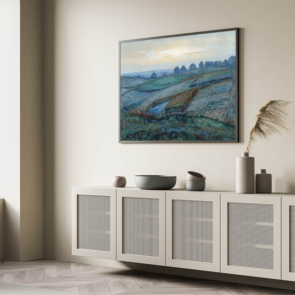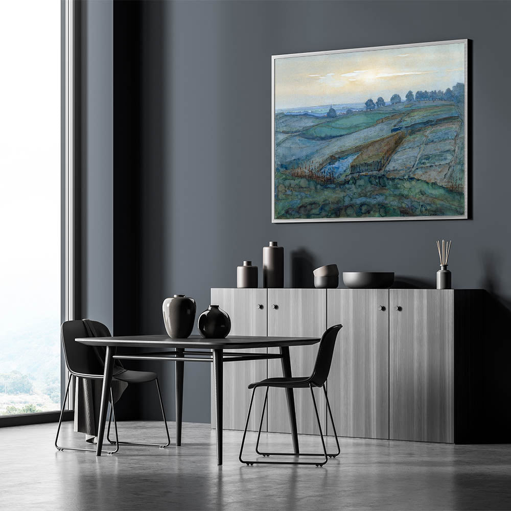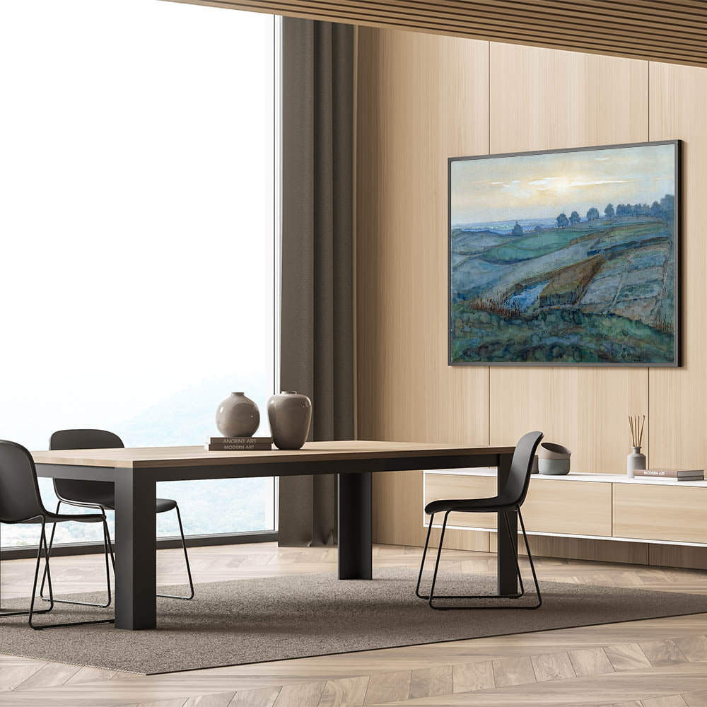 Bring the serene beauty of nature into your space with the "Modern Landscape Art." This exquisite artwork features a peaceful countryside scene in soft shades of green and blue, capturing the harmony of open fields under a tranquil sky. Its modern design elements make it an ideal choice for contemporary or minimalist decor styles, adding depth and elegance to any room.