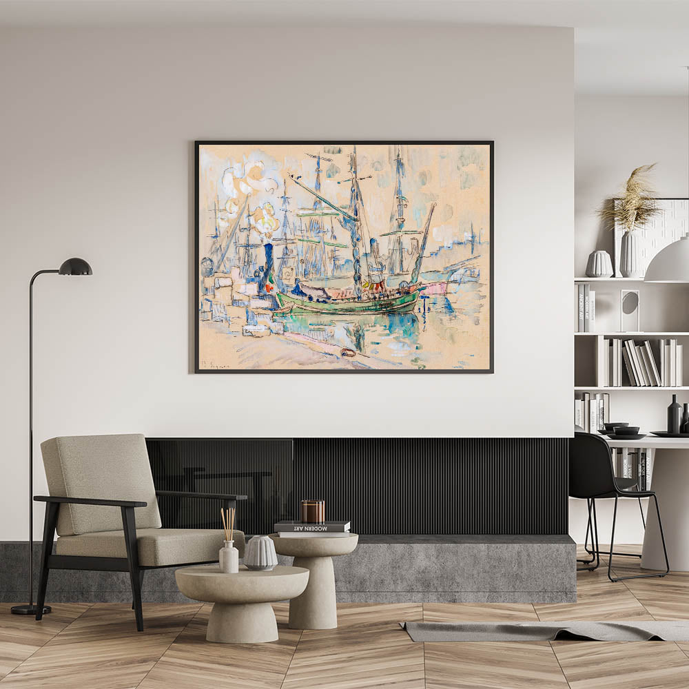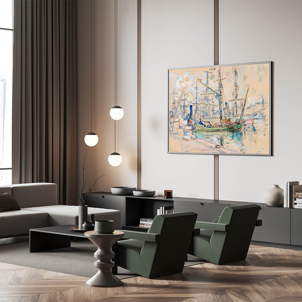 Bring the charm of a bustling harbor to your walls with this captivating piece of modern wall art. Depicting the vibrant Marseille harbor, the artwork combines delicate watercolors and expressive linework to create a dynamic nautical scene. The interplay of soft blues, greens, and earthy tones captures the liveliness of the ships, masts, and surrounding activity, offering a timeless coastal aesthetic.