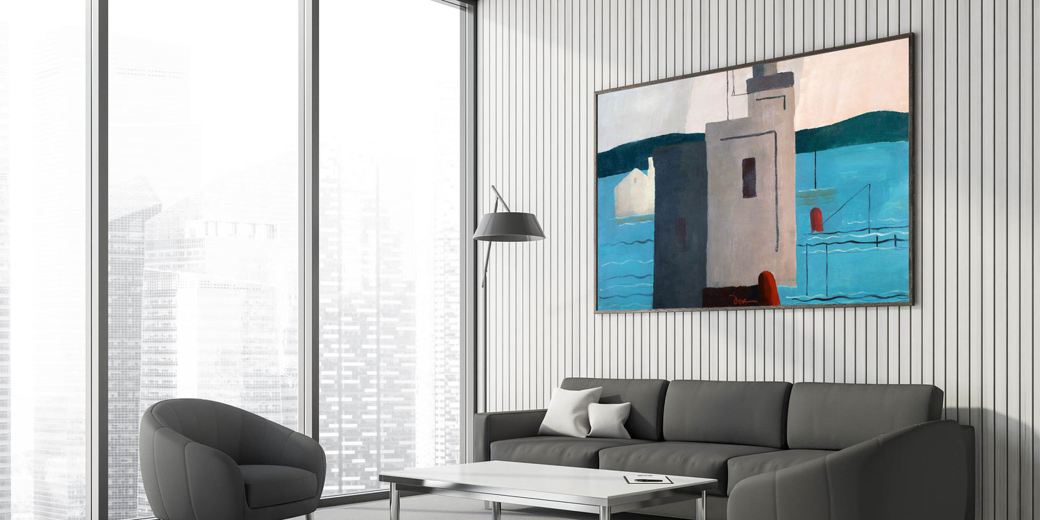 Bring a touch of modern sophistication to your home with this striking abstract depiction of a waterfront. This artwork, with its minimalist forms and bold color blocks, captures the essence of contemporary design. The interplay of soft blues, muted grays, and deep red accents creates a harmonious balance that’s both soothing and visually engaging.