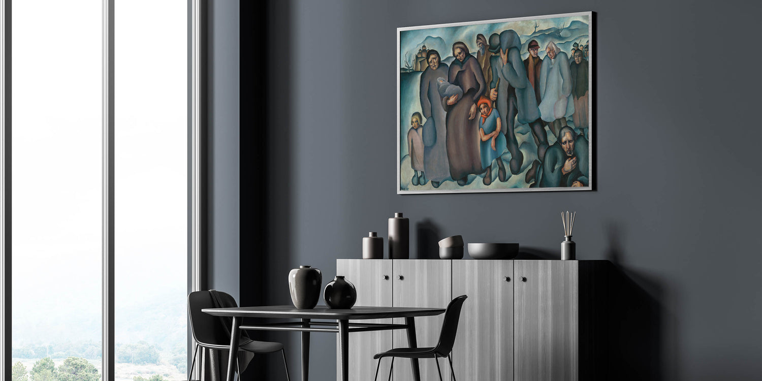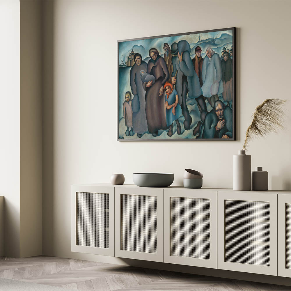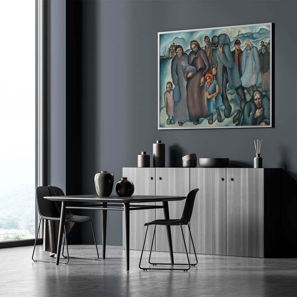 Capture the resilience and struggle of humanity with this evocative piece of modern wall art. Featuring a group of refugees in a stark winter landscape, the artwork uses deep blues, browns, and muted tones to convey the weight of their journey. The expressive faces and postures of the figures tell a story of hardship and survival, making this piece both powerful and thought-provoking.