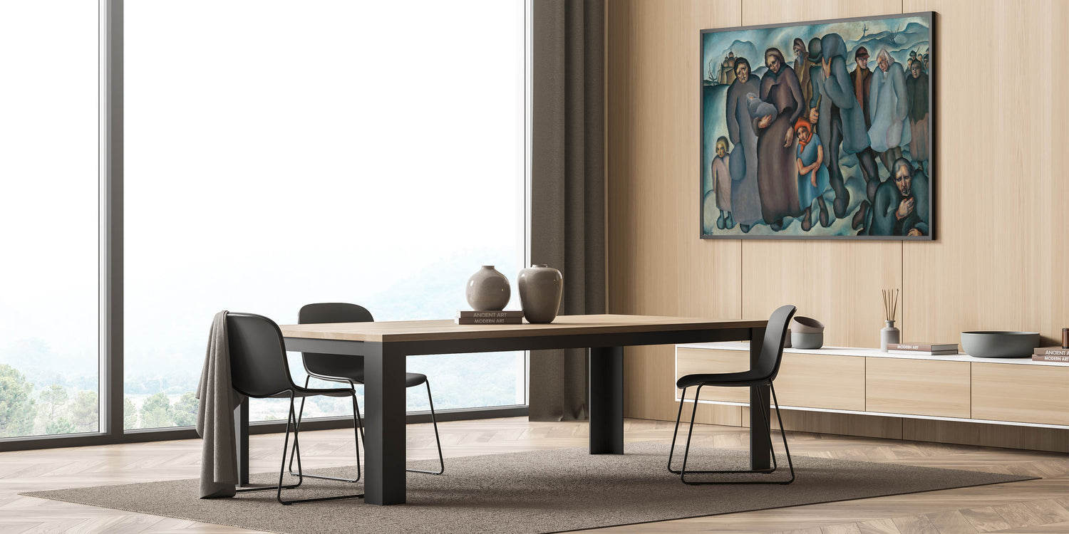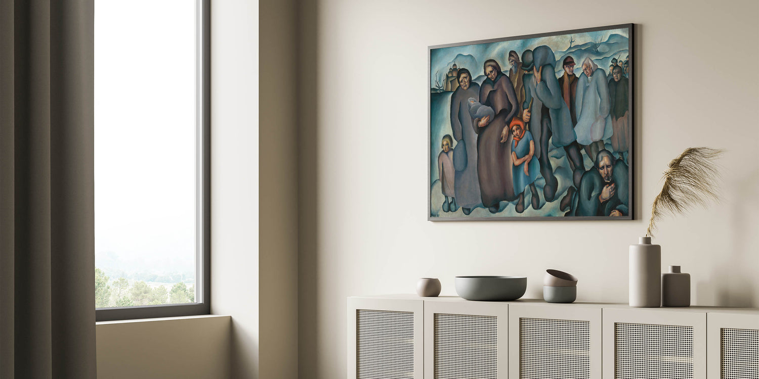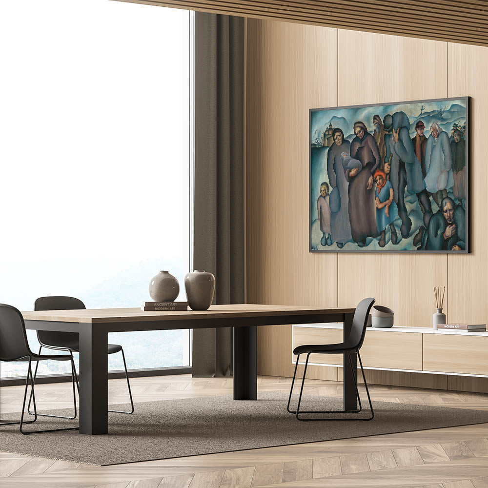 Capture the resilience and struggle of humanity with this evocative piece of modern wall art. Featuring a group of refugees in a stark winter landscape, the artwork uses deep blues, browns, and muted tones to convey the weight of their journey. The expressive faces and postures of the figures tell a story of hardship and survival, making this piece both powerful and thought-provoking.