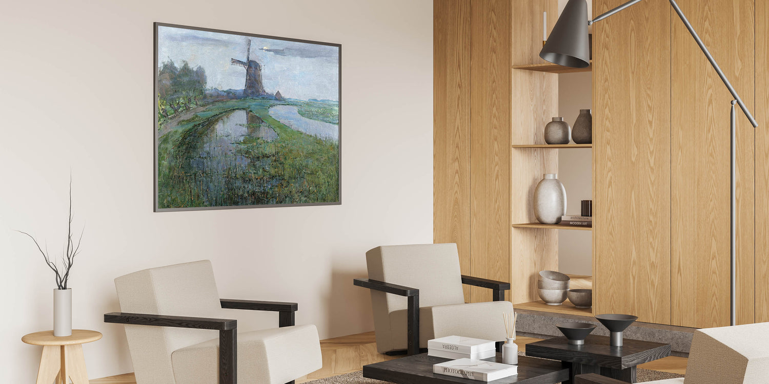 Elevate your space with this serene modern wall art inspired by Piet Mondrian's "Oostzijdse Mill along the River Gein by Moonlight." This captivating piece features a tranquil moonlit landscape, highlighted by a classic Dutch windmill and reflective waterways. The muted tones and intricate details offer a perfect blend of modern design elements and timeless artistry, making it ideal for trendy home decor enthusiasts.