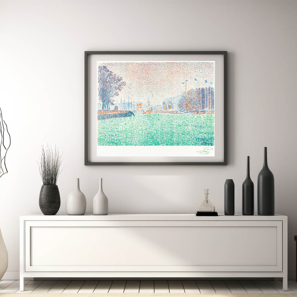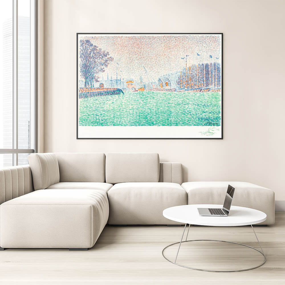 Elevate your living space with this captivating Modern Wall Art piece, showcasing a serene waterfront scene rendered in an abstract, pointillist style. This artwork is a harmonious blend of soft pastels and vibrant accents, making it a perfect addition to any contemporary home.