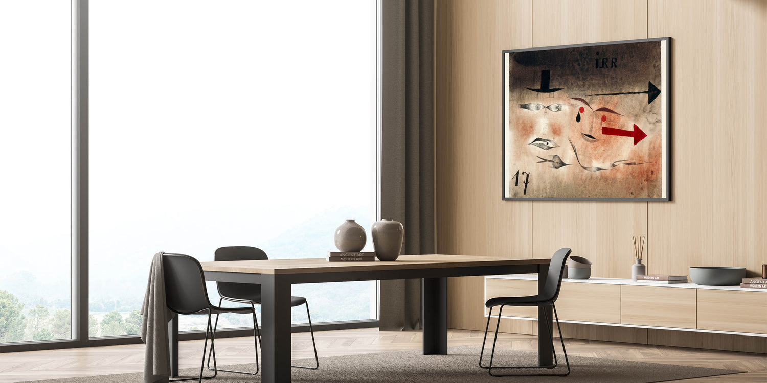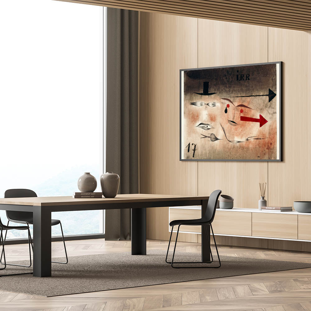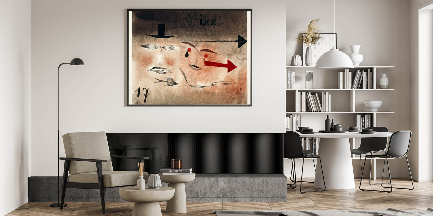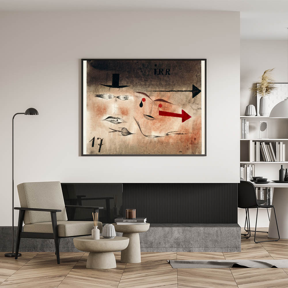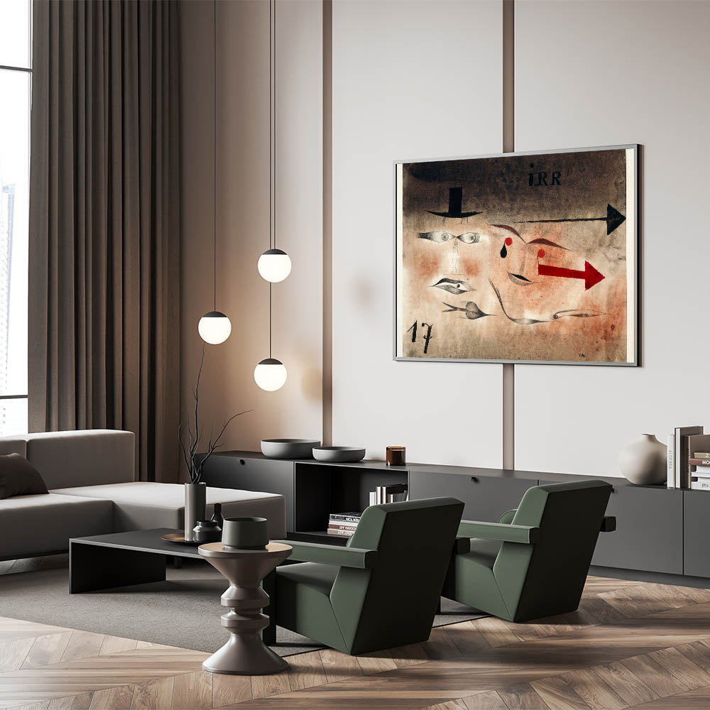 Unleash the power of abstract expression with this striking Modern Wall Art. Featuring a surreal and symbolic design, this piece, "Seventeen, Crazy," by Paul Klee, combines bold arrows, fragmented faces, and cryptic text with an earthy palette of browns, reds, and black. The juxtaposition of whimsical elements and deep, evocative tones creates a composition that is both intriguing and thought-provoking.