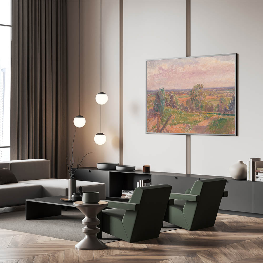 Immerse yourself in the tranquil beauty of nature with this stunning Modern Wall Art, showcasing an extensive Yorkshire landscape. This artwork features a sweeping view of the countryside, with soft pastel tones and intricate textures that capture the essence of the natural environment. The harmonious blend of greens, earthy browns, and gentle pinks evokes a sense of calm and serenity, making it an ideal addition to any modern home.